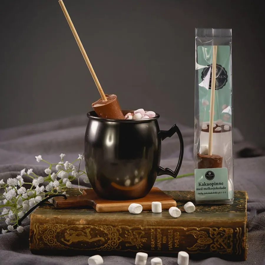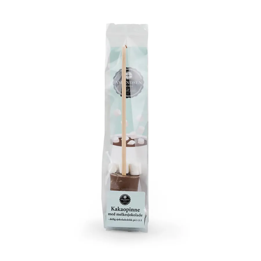 Kakaopinne med melkesjokolade fra Amundsen. Når dagene blir kaldere, slår det aldri feil med en kopp kakao inne i varmen. Alt du trenger å gjøre er å varme opp melk, legg kakaopinnen i en kopp og hell så den varme melken oppi koppen, og dermed smeltes melkesjokoladen og blir til en smakfull kopp kakao.