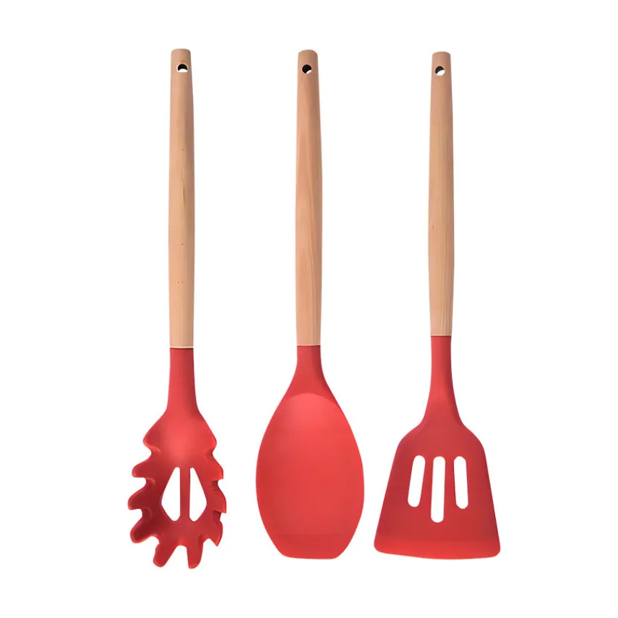 Sett med tre praktiske bakeredskaper laget av slitesterk silikon og naturlig trehåndtak, perfekt til all slags baking og matlaging. Settet består av en pastaskje, en stor røreskje og en stekespade – alt du trenger for å lage måltider som en proff! Silikonhodene er skånsomme mot alle typer gryter og panner, inkludert non-stick-belegg, og sikrer lang holdbarhet uten riper. Trehåndtakene gir et godt grep og et naturlig preg på kjøkkenet. For å bevare kvaliteten anbefales håndvask.