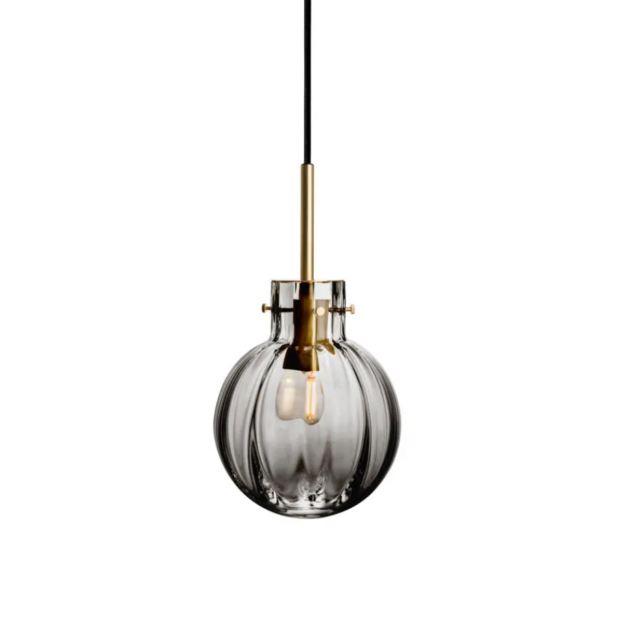 Taklampen med optikk i glasskulen er en stemningsfull lampe som kombinerer håndverkstradisjoner med moderne eleganse. Det karakteristiske optikkmønsteret skapes når den glødende glassmassen presses ned i en ring med stående lameller, som danner dype spor i glasset. Deretter blåses kulen ned i en granittform, noe som gir den en glatt ytterflate og en levende, bølget innerkjerne. Når lampen tennes, skaper dette et unikt spill av lys og skygge som gir rommet en lun og eksklusiv atmosfære.Alle krystallkulene munnblåses og håndslipes på Hadeland Glassverk av våre erfarne glassblåsere og slipere. Mer enn syv ulike håndverkere legger sitt preg på hver lampe, noe som gjør hvert eksemplar unikt. Den røkgrå fargetonen gir en sofistikert og tidløs karakter, som passer like godt alene som i grupper over spisebord, kjøkkenøy eller i stue. Designet er signert Maud Gj. Bugge, og bygger på Hadeland Glassverks stolte håndverkstradisjoner.Lampen leveres med sort tekstiltrukket kabel (3 meter), singel baldakin og er dimbar for fleksibel lyssetting. Montering må utføres av elektriker, og monteringsanvisning følger med.Spesifikasjoner: Sokkel: E14 Pæreanbefaling: Klar, dimbar filamentpære 3–4 W, 220 V Lyskilde medfølger ikke Montering av elektriker påkrevd, monteringsanvisning følger med