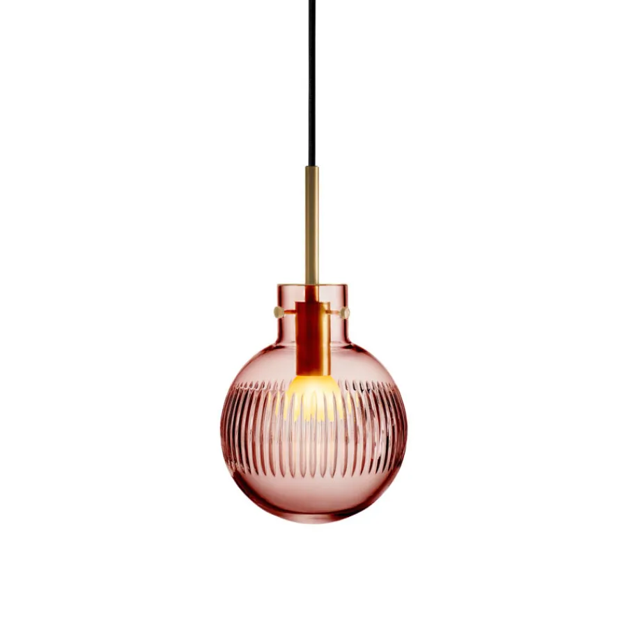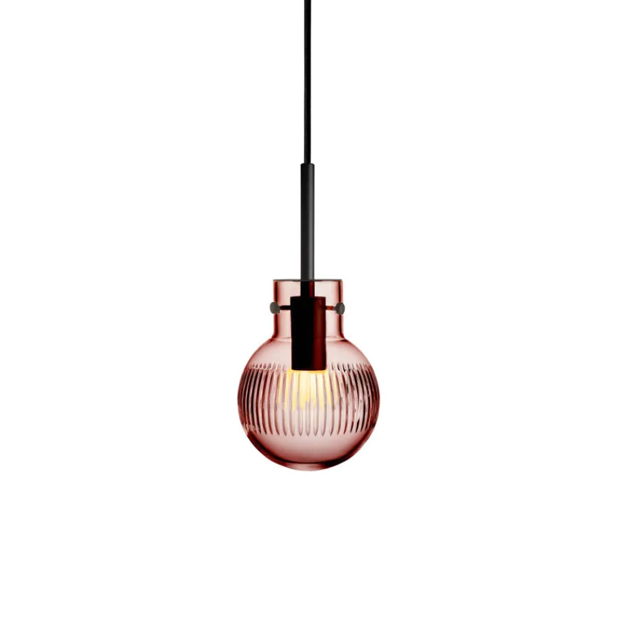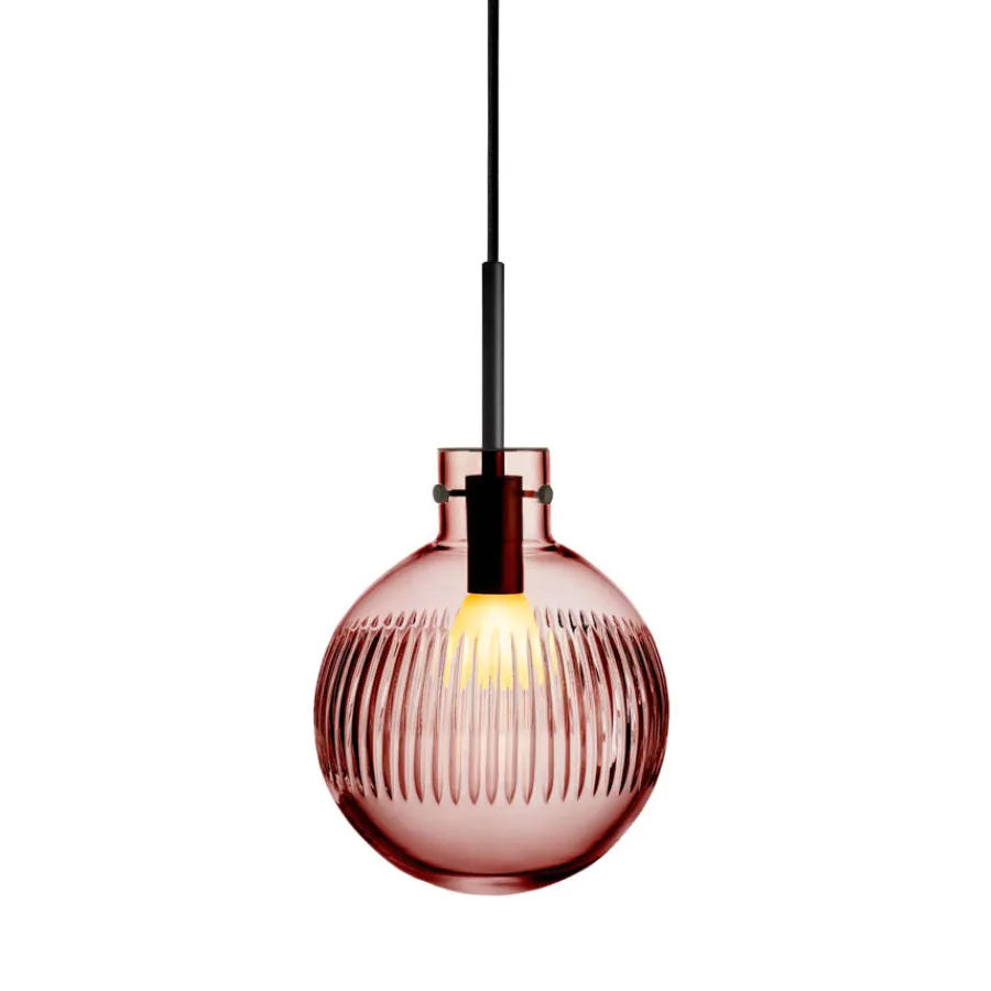 Krystallkule Taklampe Skjær i fargen Morgenrød har et mykt og varmt uttrykk som skaper en poetisk stemning i rommet. Kulen er glatt i utgangspunktet, og slipes for hånd med vertikale skjær som gir et delikat lysmønster.