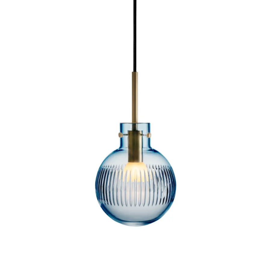 Krystallkule Taklampe Skjær Stålblå er en lampe som kombinerer friskhet og eleganse. Den glatte krystallkulen håndslipes med et presist, vertikalt skjær-mønster som skaper en dynamisk refleksjon av lyset.