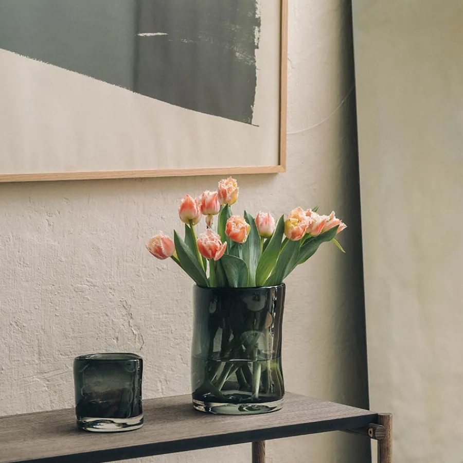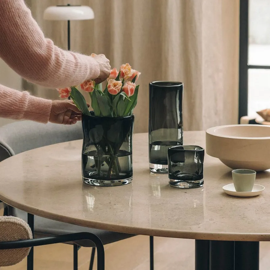 Munnblåst telysholder i røkgrå fra Hadeland Glassverk og serien Sine. Den flotte lyslykten kommer i en røkgrå tone som sammen med de organiske formene skaper et stilfullt og delikat preg til stuen og bordet. Serien er designet av Maud Gjeruldsen Bugge og byr i tillegg til den lille lyslykten på to flotte vaser som kan kombineres for et dekorativt uttrykk. Telysholderen måler 12,5 cm x 10,5 cm og er også flott som en liten vase fylt med en liten bukett av friske blomster. Hvert stykke fra serien håndslipes og munnblåses, som gjør hvert produkt unikt.