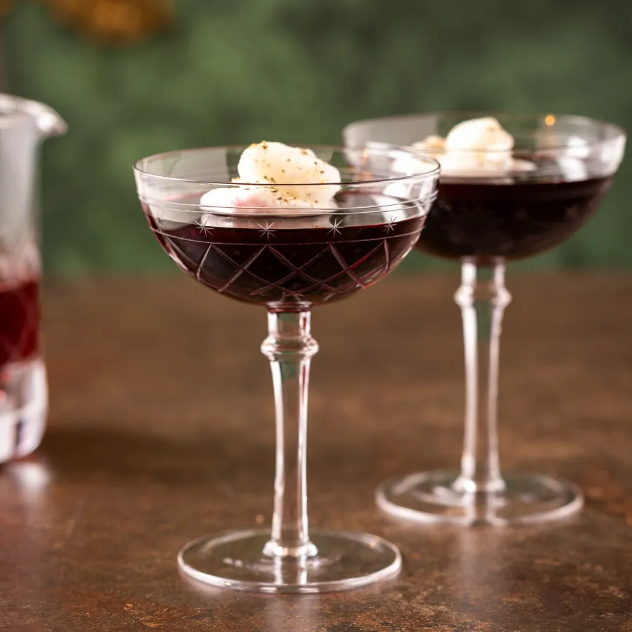 Champagneskålene i Victoria-serien er en hyllest til den klassiske serveringsstilen fra 1920-tallet. Med sitt elegante, vide coupe-design og håndslipte ruteslip-mønster, skaper de en følelse av glamour og historisk eleganse ved enhver anledning. Hver skål rommer 25 cl – perfekt for champagne, mousserende vin eller eksklusive dessertserveringer.