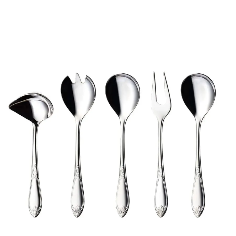 Serveringssett på fem deler fra den elegante serien Nina fra Hardanger Bestikk. Den høytidelige serien ble designet av Odd Leikvoll i 1998, med en inspirasjon fra rosemaling og rokokko-stilen fra 1700-tallet. Serveringsbestikket tilfører et elegant preg på et fulldekket festbord, og det lille ekstra til hverdagsmiddagen. Alle deler kan vaskes i oppvaskmaskin.