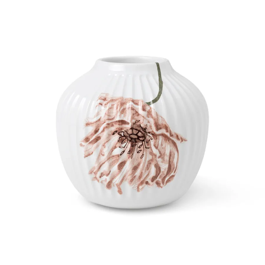 Vase 13 cm fra Kähler i serien Hammershøi Poppy. Det elegante serviset Hammershøi Poppy er en linjeutvidelse fra det klassiske serviset Hammershøi, designet av Hans-Christian Bauer og dekorert av Rikke Jacobsen. Det elegante blomstermotivet kombinert med de klassiske rillene fra Hammershøi serien gir serien et unikt og sjarmerende uttrykk. For å fremheve blomstens skjørhet og nåde valgte Rikke Jacobsen å dekorere vasen med en nydelig rosa valmueblomst. Vasen kan kombineres med det klassiske Hammershøi serviset i hvitt for et stilrent og elegant preg.