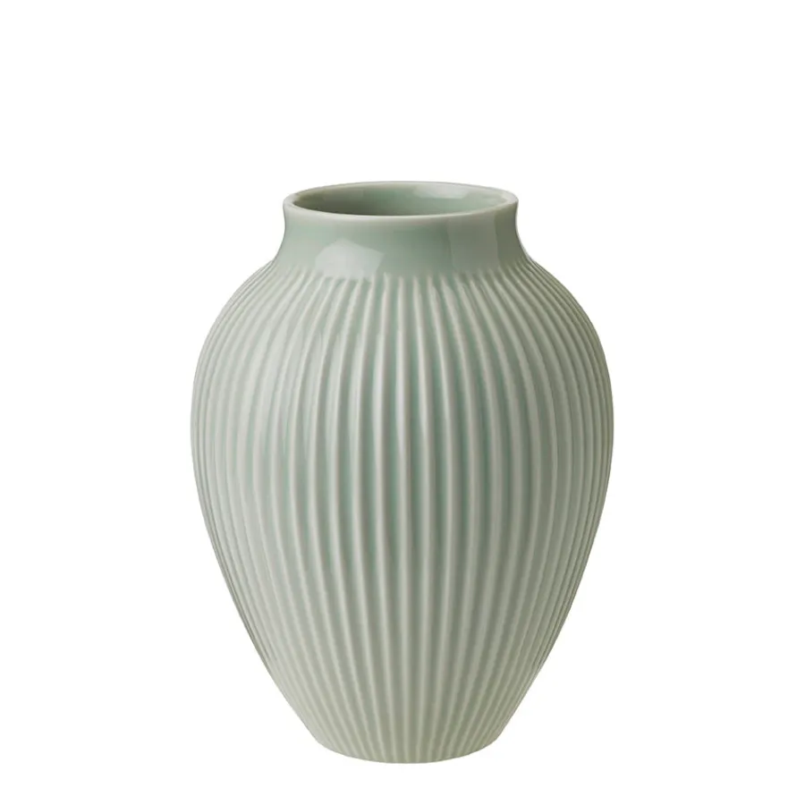 Vase i mintgrønn fra den danske merkevaren Knabstrup Keramik. Den opprinnelige klassiske og elegante formen ble først introdusert på slutten av 1940-tallet, og den dag i dag finnes de vakre riflede vasene i moderne nordiske farger som står i stil til den enkle og hjemmekoselige innredningen.