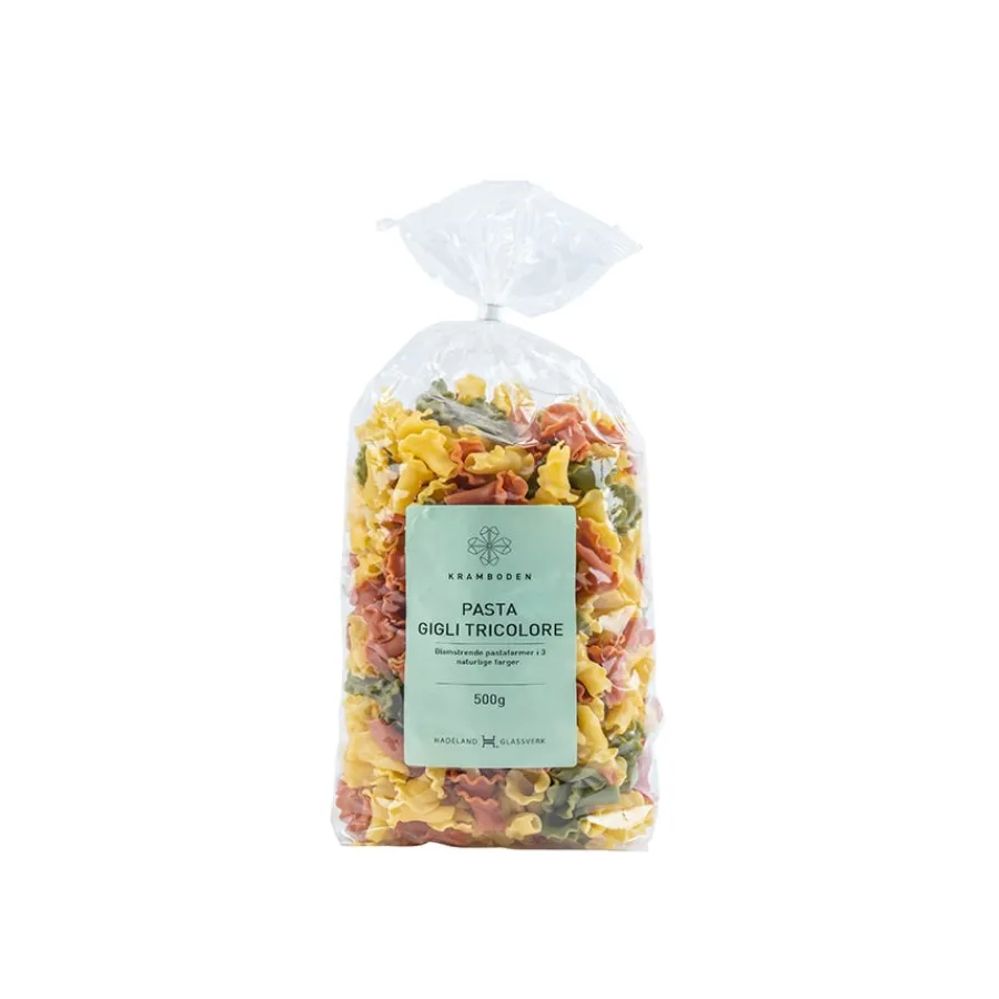 Pasta gigle i 3 farger fra Kramboden. Med en utforming etterlignende blomsterklokker blir denne pastaen vakker å servere på bordet. Pastatypen holder godt på sauser, og er utmerket til kalde pastaretter. Koktide på 8 minutter i lettsaltet vann.