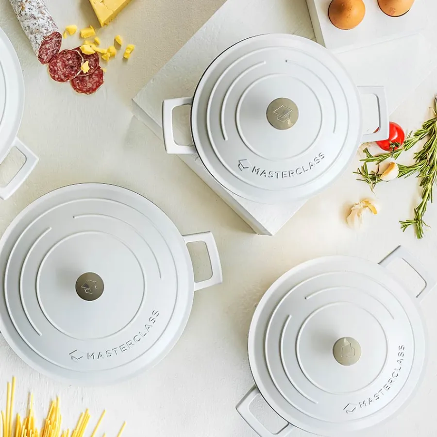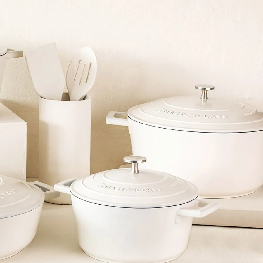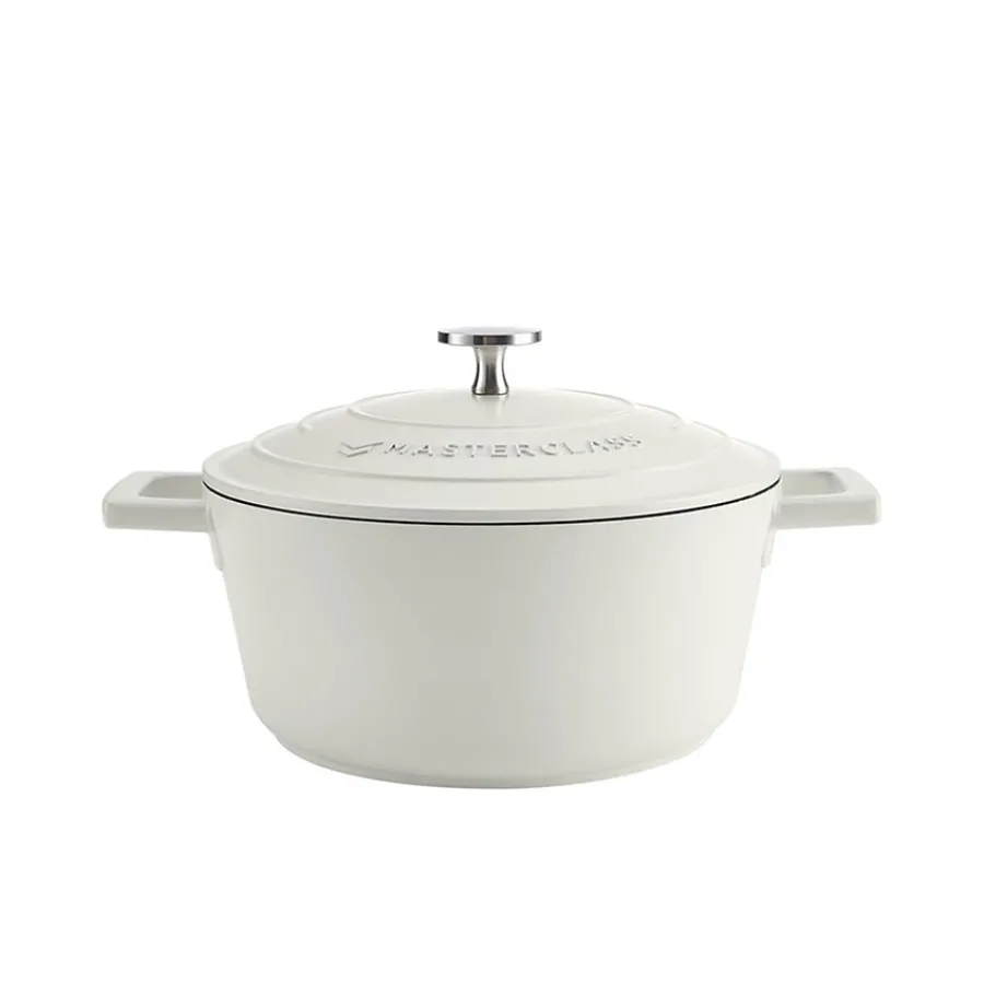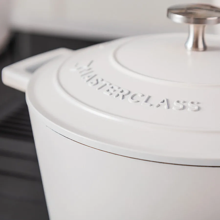 Gryte på 2,5 liter fremstilt i fargen krem fra Masterclass. Grytens materiale av støpt aluminium sikrer de gode robuste egenskapene man får fra støpejern, i et lett materiale som er enkelt å håndtere. Aluminium kjennetegnes for gi en effektiv og jevn varmefordeling, og i kombinasjon med det utformede dobbelte ripesikre belegget får du en robust gryte med de gode egenskapene man får fra non-stick belegg. Her får man en klassiker på kjøkkenet som er like flott til tilberedelsen som til servering av maten. Gryten tåler oppvaskmaskin og kan brukes på alle koketopper, inkludert induksjon.