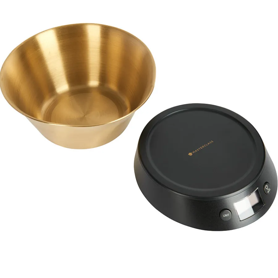 Kjøkkenvekt i sort med bolle i fargen gull fra Masterclass. Den praktiske kjøkkenvekten kan veie opptil 5 kg, og er utformet med en LCD-skjerm som er enkel å bruke.
