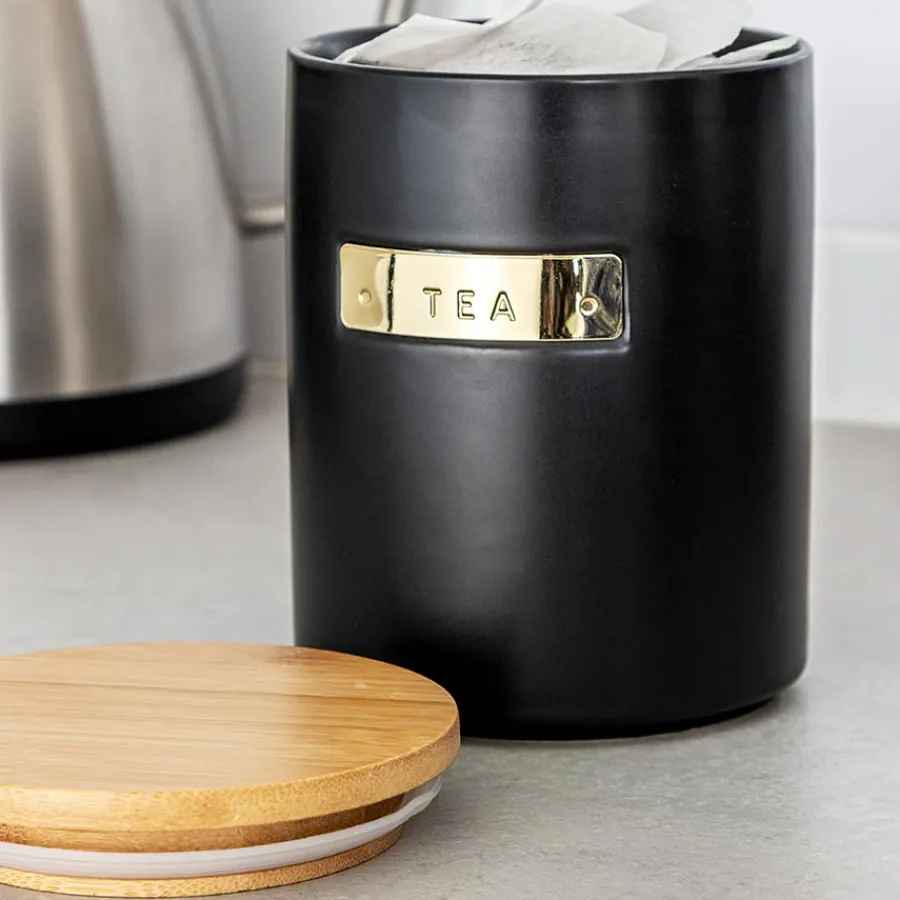 Sort oppbevaringsboks til te i 1 liter med lokk fra Masterclass. Hold det organisert på kjøkkenet med den stilfulle teboksen med et elegant lokk av bambus som sørger for en lufttett forsegling. La oppbevaringsboksen stå pent alene, eller kombiner den med en av de andre oppbevaringsboksene til kaffe eller sukker i samme flotte design fra Masterclass.