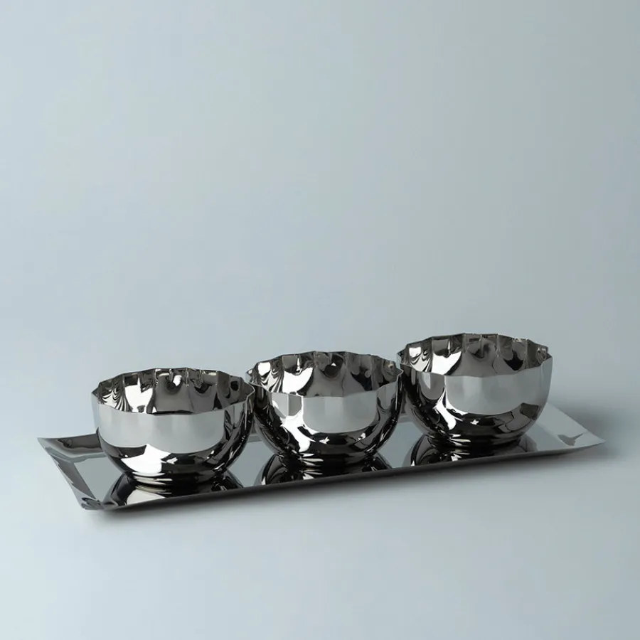 Rustfritt stål 14/1 sørger for en slitesterk og hygienisk overflate som ikke påvirker smaken på maten. Perfekt til tapas, småkaker eller tilbehør på buffeten. Den minimalistiske designen gjør at settet enkelt kan kombineres med andre serveringsdeler fra serien.