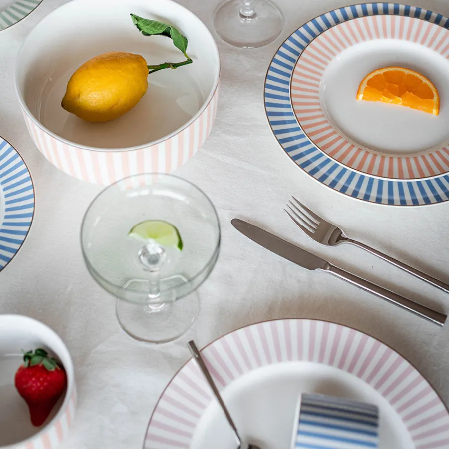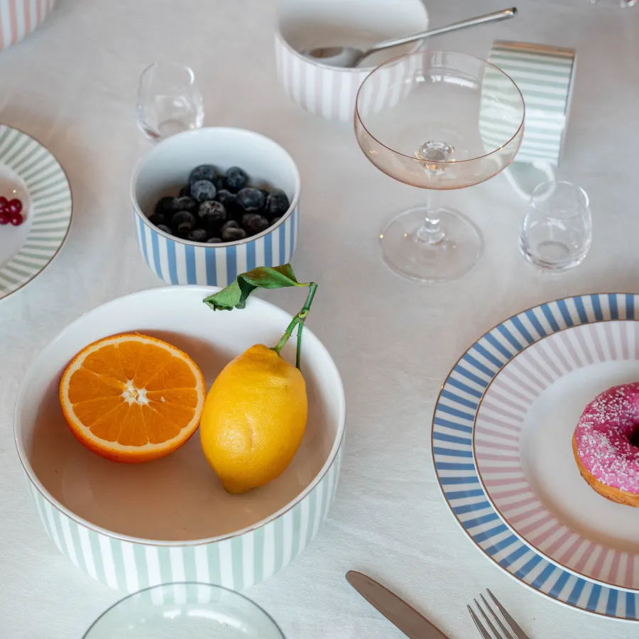 Abby asjett i livlig oransje setter en energisk og varm stemning på bordet. Med sitt spreke stripemønster og gullkant gir denne asjetten på 21 cm et fargerikt og sofistikert uttrykk – perfekt til servering av kaker, småretter eller frokost.