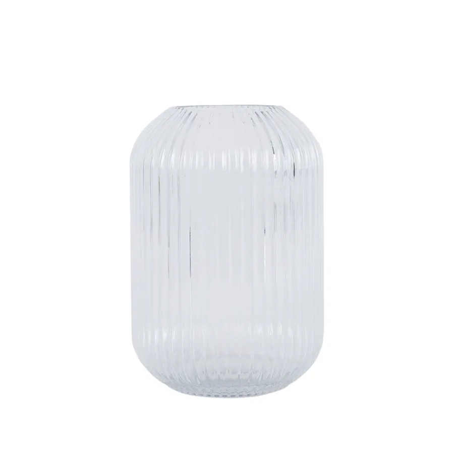 Vase med tidsriktige riller i klart glass fra Nova Edge. Den romslige formen gjør det enkelt å plassere dine favorittblomster for en romantisk stemning, eller kvister og eukalyptus for å skape en røffere look i rommet. Uansett vil vasen bidra til å løfte estetikken i hjemmet. Vasen er 22 cm høy.