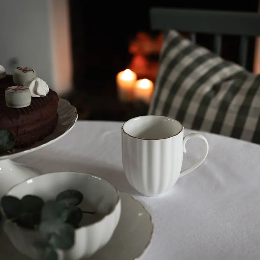 Nyt morgenkaffen eller kveldsteen med dette elegante kruset fra serviset Lilly. Med sin klassiske hvite overflate og delikate gullkant gir det et sofistikert uttrykk til både hverdags- og festbordet. Kruset rommer 32 cl og har en ergonomisk utformet hank som gjør det behagelig å holde. Det tidløse designet passer perfekt til jul, men også gjennom hele året som en del av et stilrent servise. Kruset kan brukes alene eller kombineres med resten av Lilly-serviset for en helhetlig og luksuriøs borddekking. Enten du serverer kaffe, te eller varm kakao, tilfører dette kruset en eksklusiv følelse til enhver drikkeopplevelse.