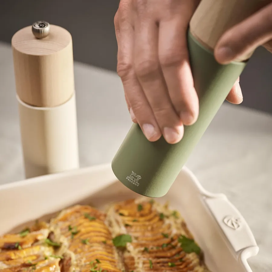 Med sin matte bregnegrønne finish og avrundede design er denne pepperkvernen både dekorativ og behagelig å bruke. Den 21 cm høye formen gir god kapasitet, og det slitesterke kvernverket fra Peugeot sørger for jevn maling hver gang. En stilsikker detalj på kjøkkenet – både i bruk og utseende.