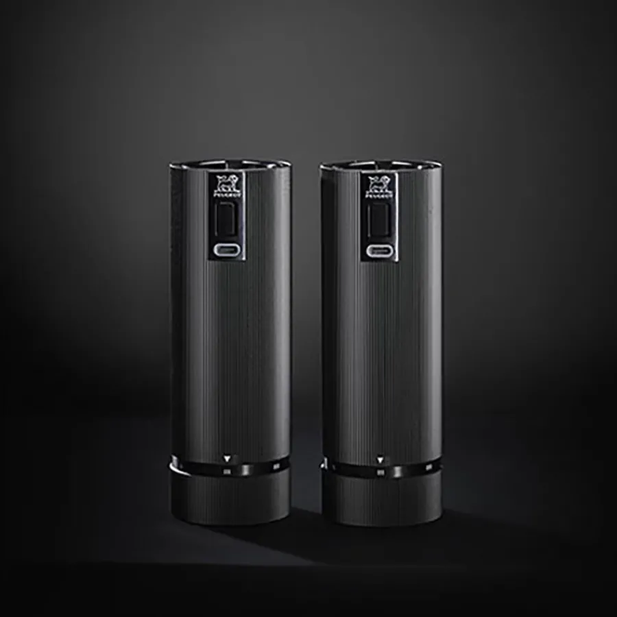 Peugeot Night er et sett med elektrisk salt- og pepperkvern, begge i matt svart finish og med høyde på 15 cm. Det stilrene designet kombineres med brukervennlig én-håndsbetjening og pålitelig kvernverk for salt og pepper. Perfekt for deg som ønsker både stil og komfort ved matlaging og servering.
