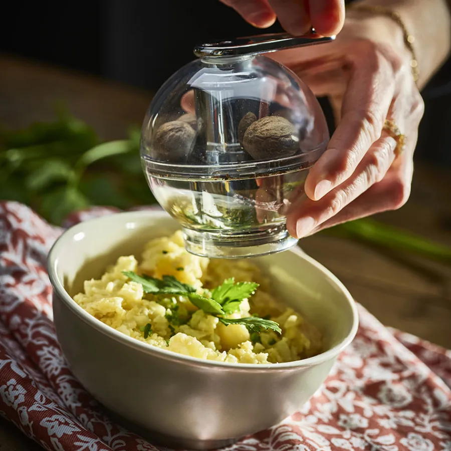 Tidore er en kompakt muskatnøttkvern laget i klart akrylmateriale som gir full oversikt over innholdet. Kvernen har et fjærbelastet metallgitter som holder nøtten på plass og maler presist ved hvert dreiegrep. Perfekt til pasta, potetretter eller baking der fersk muskat gir en ekstra dimensjon. Praktisk, elegant og enkel å bruke, akkurat slik Peugeot er kjent for.