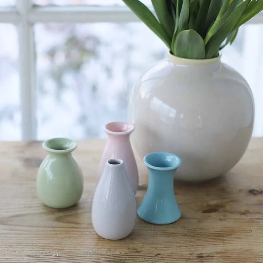 Skap en sjarmerende og frisk atmosfære med disse vakre minivasene fra Porsgrunds Porselænsfabrik. Pakken inneholder fire unike vaser i myke pastellfarger – rosa, grønn, grå og blå – som tilfører et delikat preg til hjemmet ditt. Med ulike former og en matt overflate gir de en moderne og stilfull kontrast til friske blomster. Disse små vasene passer perfekt til snittblomster, kvister eller som en dekorativ detalj alene. Plasser dem samlet for en harmonisk look, eller fordel dem rundt i hjemmet for små fargeinnslag. Ideelle til både hverdagsbruk og festlige anledninger!