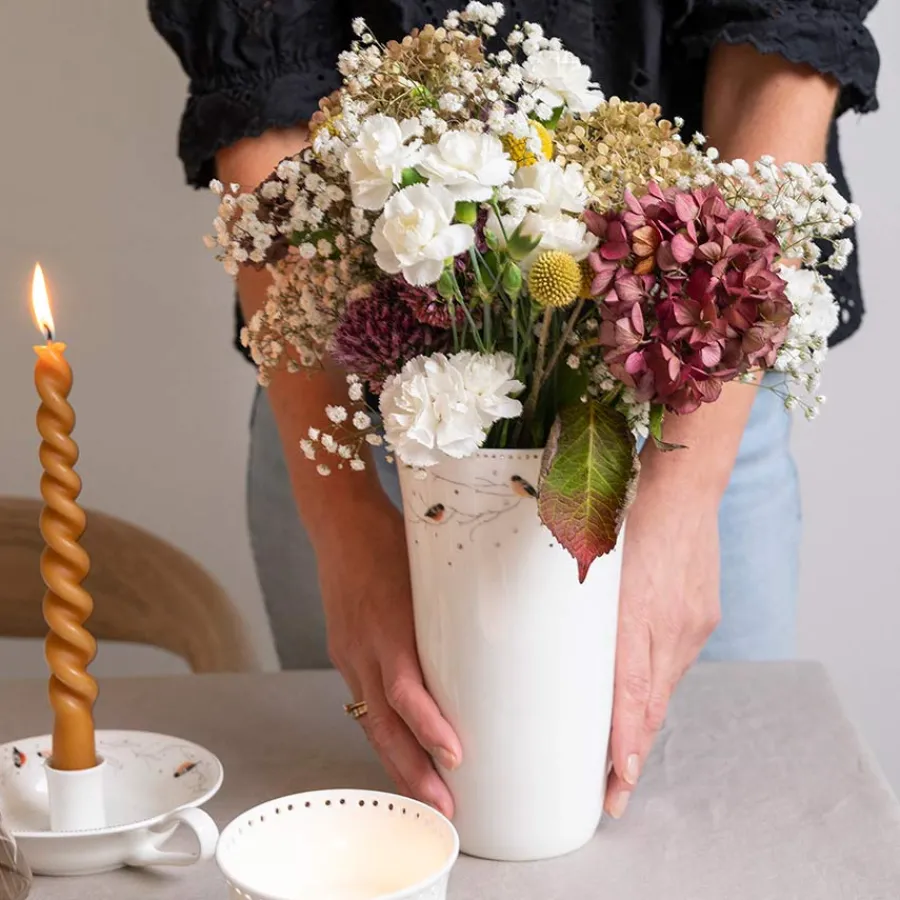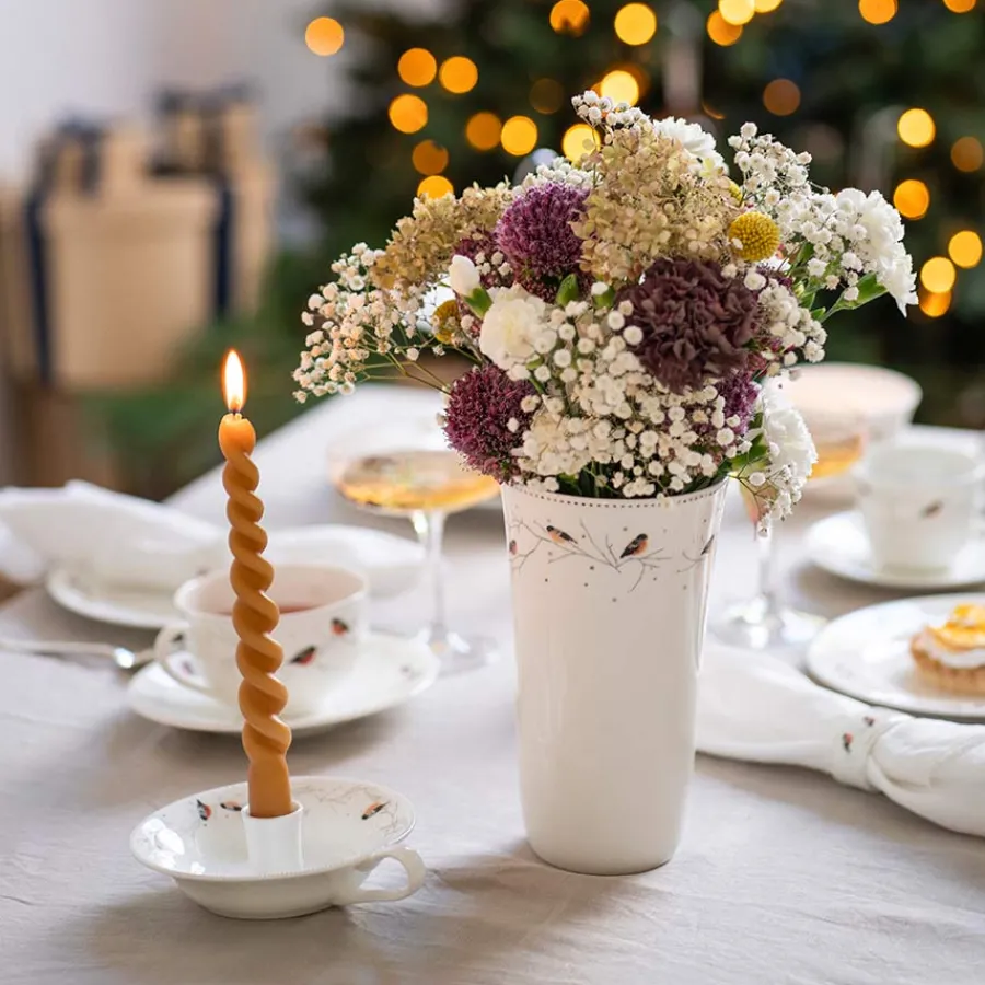 Vase på 21 cm fra den vakre serien Dompap fra Porsgrunds Porselænsfabrik. Inspirert av den norske vinteren har serien fått et vakkert motiv av bare grener og den koselige røde fuglen Dompap, som ofte assosieres med juletiden. Den flotte vasen kan fylles med friske blomster eller dekorative grener, og er med sitt stemningsfulle design blir den flott både til jul og vintertiden.