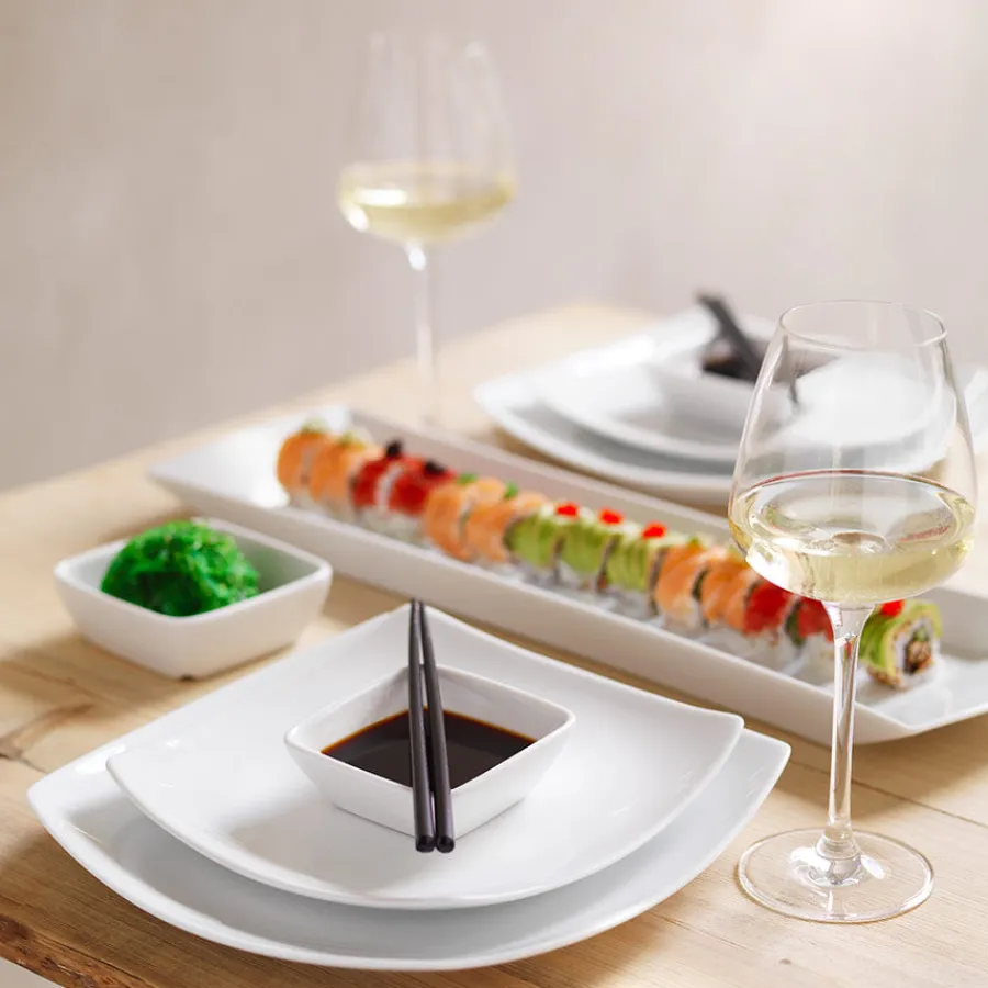 Firkantede tallerkener på 21 cm fra Sense, Porsgrunds Porselænsfabriks mest komplette servise. Det hvite porselenet dekker middagsbordet i en klassisk og elegant stil, men kan også friskes opp med servisedeler i farger eller mønstre. Det kan kombineres i utallige uttrykk for et personlig preg. Tallerkenene tåler både ovn, mikro og oppvaskmaskin.