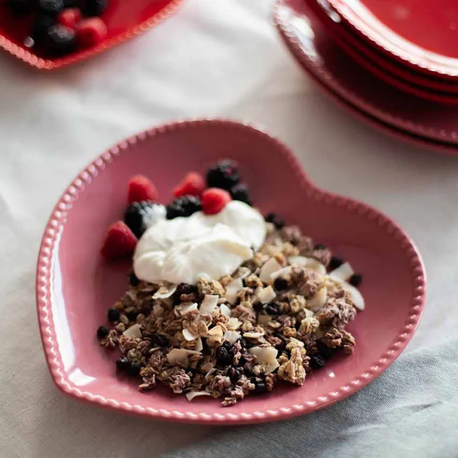 Denne hjerteformede tallerkenen i dyp rød farge er perfekt for å skape en varm og innbydende borddekking. Med en størrelse på 20 cm passer den ideelt til servering av frokost, kaker og småretter. Den dekorative perlekanten gir et elegant uttrykk som gjør tallerkenen like vakker til hverdagsbruk som til spesielle anledninger. Laget av slitesterk keramikk, er den både praktisk og stilfull. Tallerkenen tåler oppvaskmaskin, noe som gjør rengjøringen enkel og bekymringsfri.