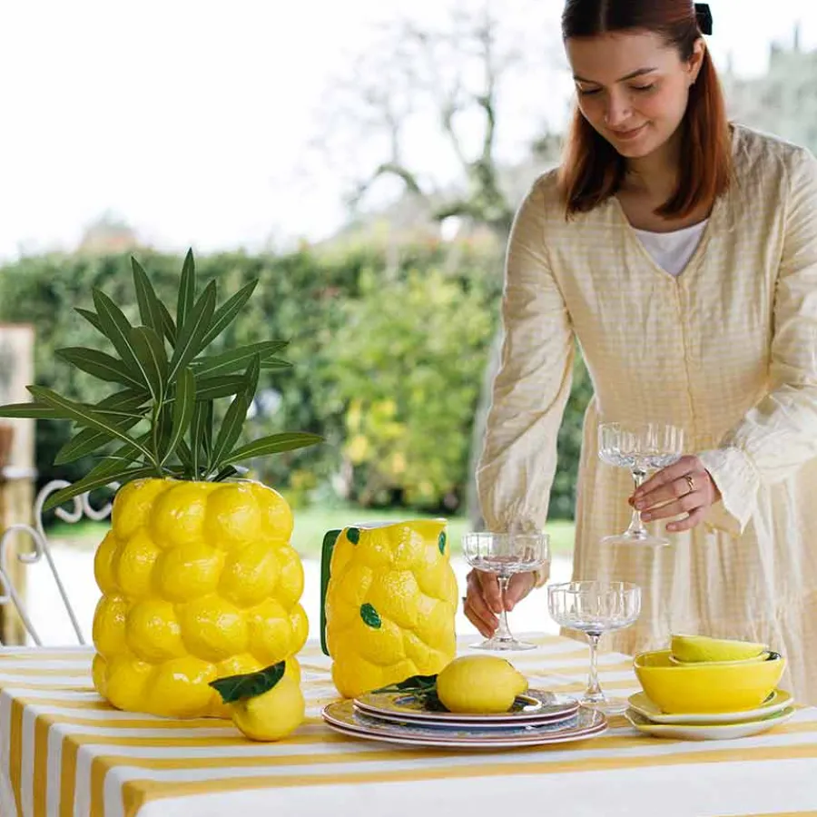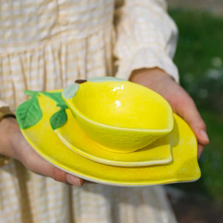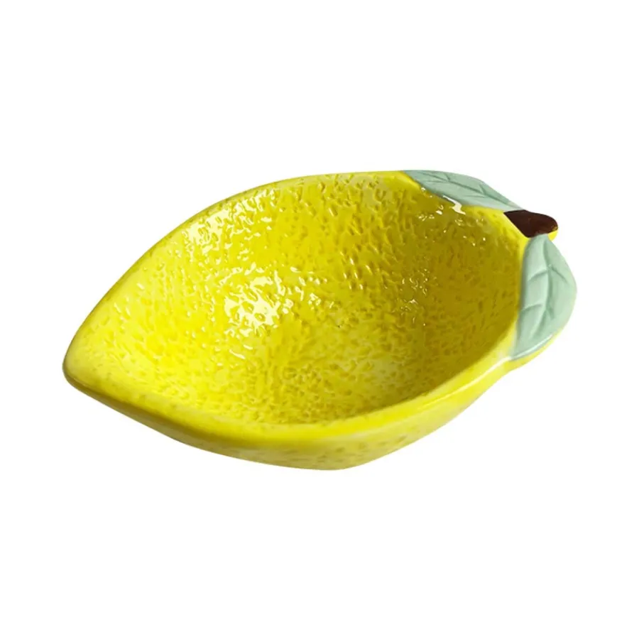 Denne lille, men sjarmerende skålen fra Capri Collection er formet som en saftig sitron og bringer en leken eleganse til borddekkingen din. Med en diameter på 13 cm er den ideell for småretter og snacks. Den blanke glasuren og den detaljerte strukturen gjør den til et blikkfang på ethvert bord, enten du bruker den alene eller sammen med andre deler fra kolleksjonen.Den slitesterke keramikkoverflaten sikrer langvarig bruk, og skålen tåler oppvaskmaskin for enkel rengjøring. Den unike formen gjør den også til en fin dekorasjonsdetalj på kjøkkenet når den ikke er i bruk. Gi borddekkingen en frisk touch med denne morsomme og funksjonelle skålen. Bruk den til tapasbordet, sommerpikniken eller som en del av en fargerik servisesamling.