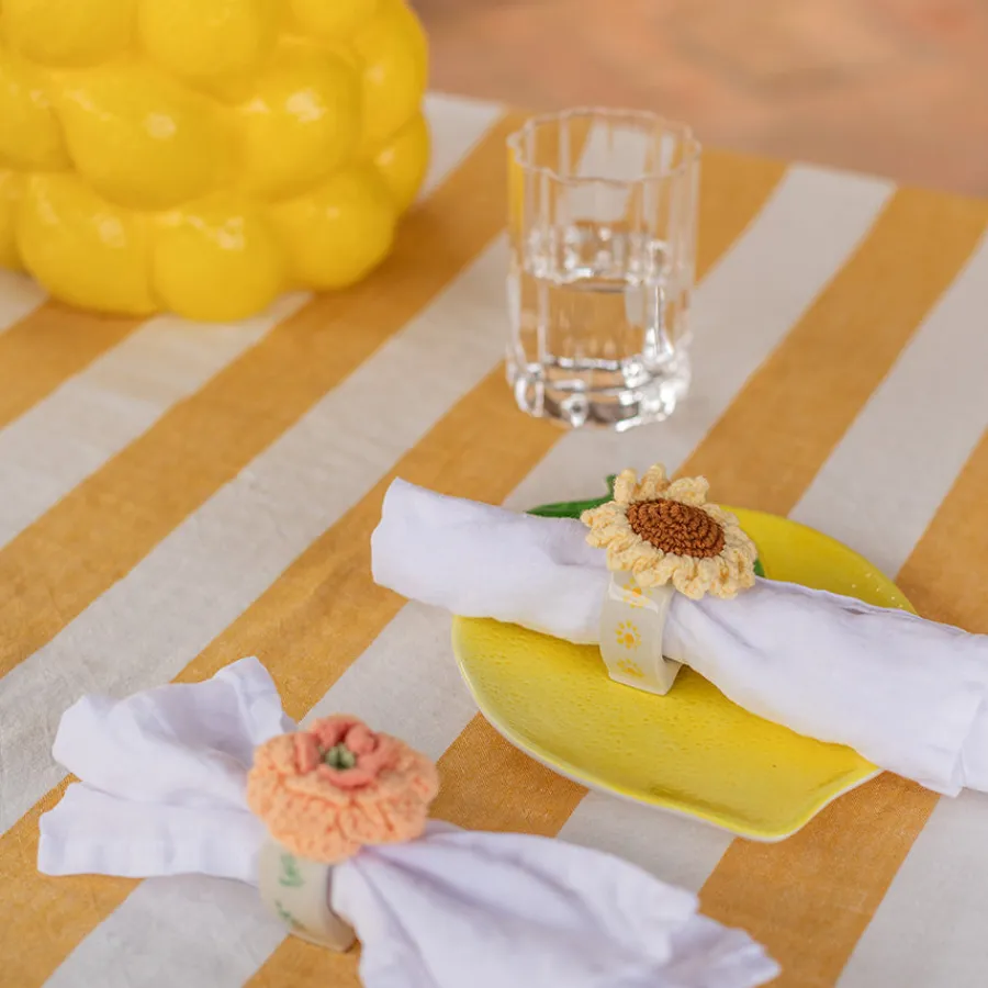 Gi borddekkingen et friskt og sommerlig preg med disse sjarmerende serviettringene i porselen, dekorert med blomster i hvit og oransje. De heklede blomstene gir en myk kontrast til den glatte, glaserte porselensringen – perfekt til å skape et lunt og innbydende bord.Dette settet passer ypperlig til både uformelle og høytidelige anledninger – fra sommerfrokost på terrassen til påskefeiring, bursdag eller grillkveld. Blomstene gir et naturlig og glad uttrykk som fremhever både lyse og fargerike servietter.Med sitt lekne design blir disse serviettringene et dekorativt element i seg selv. Kombiner dem gjerne med matchende servise eller blomster på bordet for en helhetlig og gjennomført stil.