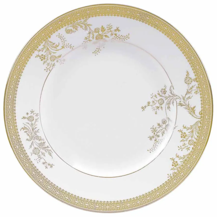 Asjett fra serviset Vera Wang Lace Gold fra Wedgwood. Vera Wang har designet serviset Lace Gold med inspirasjon fra luksuriøse detaljer fra hennes egne brudekjolekolleksjoner. Mønsteret i serviset kombinerer blomster med blonder i gull på et helt unikt vis og skaper et elegant uttrykk på middagsbordet. Serviset i benporselen kan vaskes i oppvaskmaskin, men ikke settes i mikrobølgeovn.