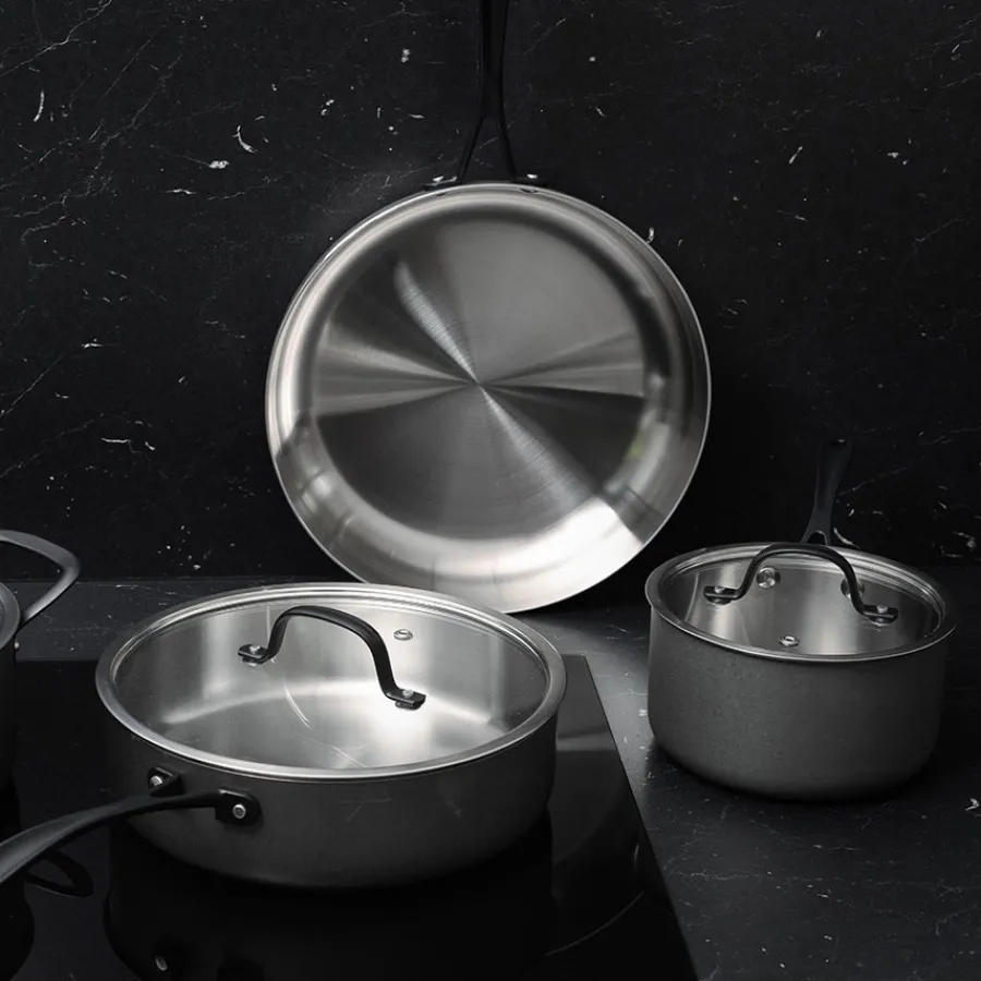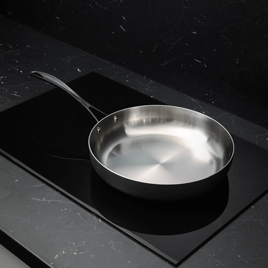 Denne stekepannen kombinerer funksjonalitet og stil, med en stor overflate som er ideell for steking av kjøtt, fisk og grønnsaker. Den er laget av 18/10 rustfritt stål med en 2,5 mm trelagskonstruksjon som gir perfekt varmefordeling og hindrer hotspots. Det oksiderte stålet gir et røft preg, mens de sorte, ovnsikre håndtakene sørger for en robust holdbarhet. Kompatibel med alle typer koketopper, inkludert induksjon.