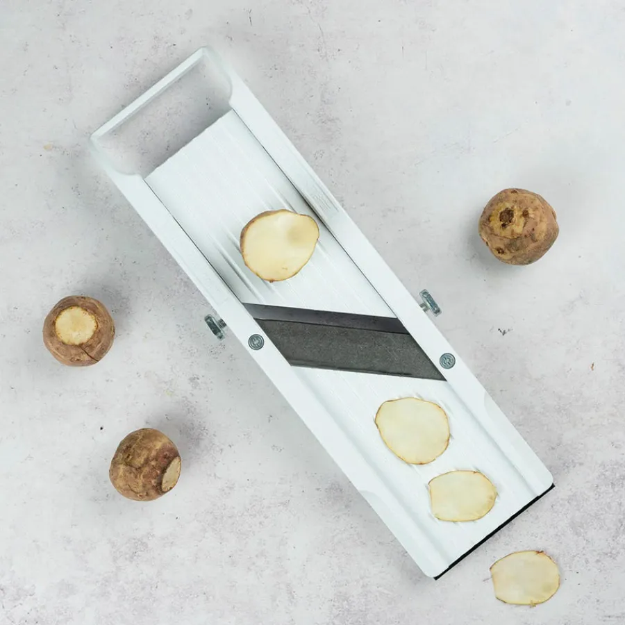 Denne førsteklasses mandolinen gjør det enkelt å skjære grønnsaker og rotfrukter i presise skiver eller strimler. Med et håndslipt, trinnløst blad kan du justere tykkelsen fra 0,5 til 7 mm for ønsket resultat. Den leveres med tre utskiftbare blader for strimling og julienne, og fingerbeskyttelsen sikrer trygg bruk. Anti-skli på undersiden gir stabilitet, og den kompakte størrelsen gjør den lett å håndtere.
