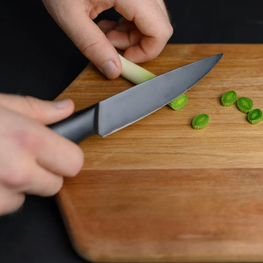Knivsett med tre kniver som fyller de fleste kutte- og skjærebehov på et kjøkken. De stilige, sorte knivene er fremstilt i rustfritt 3Cr13 stål og er ergonomisk utformet for et sikkert grep. Knivene kan vaskes i oppvaskmaskin, men håndvask anbefales for lengre holdbarhet.