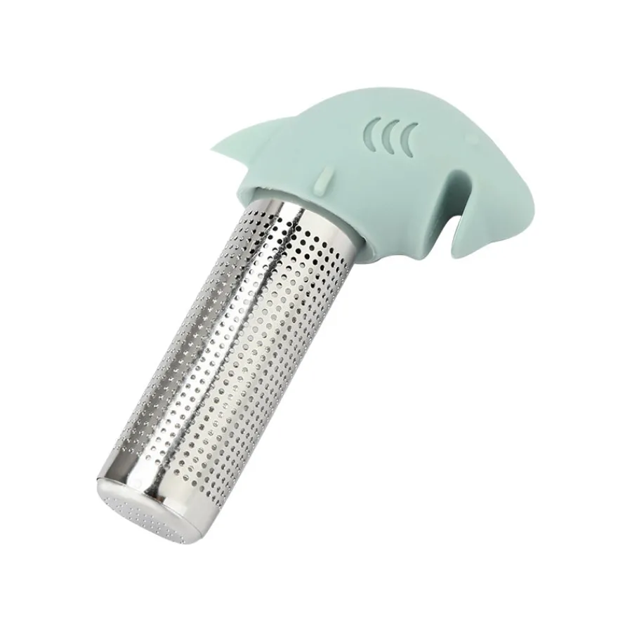 Tesil i silikon og rustfritt stål. Tesilen er formet som en morsom hai som biter seg fast i en deilig kopp med te.
