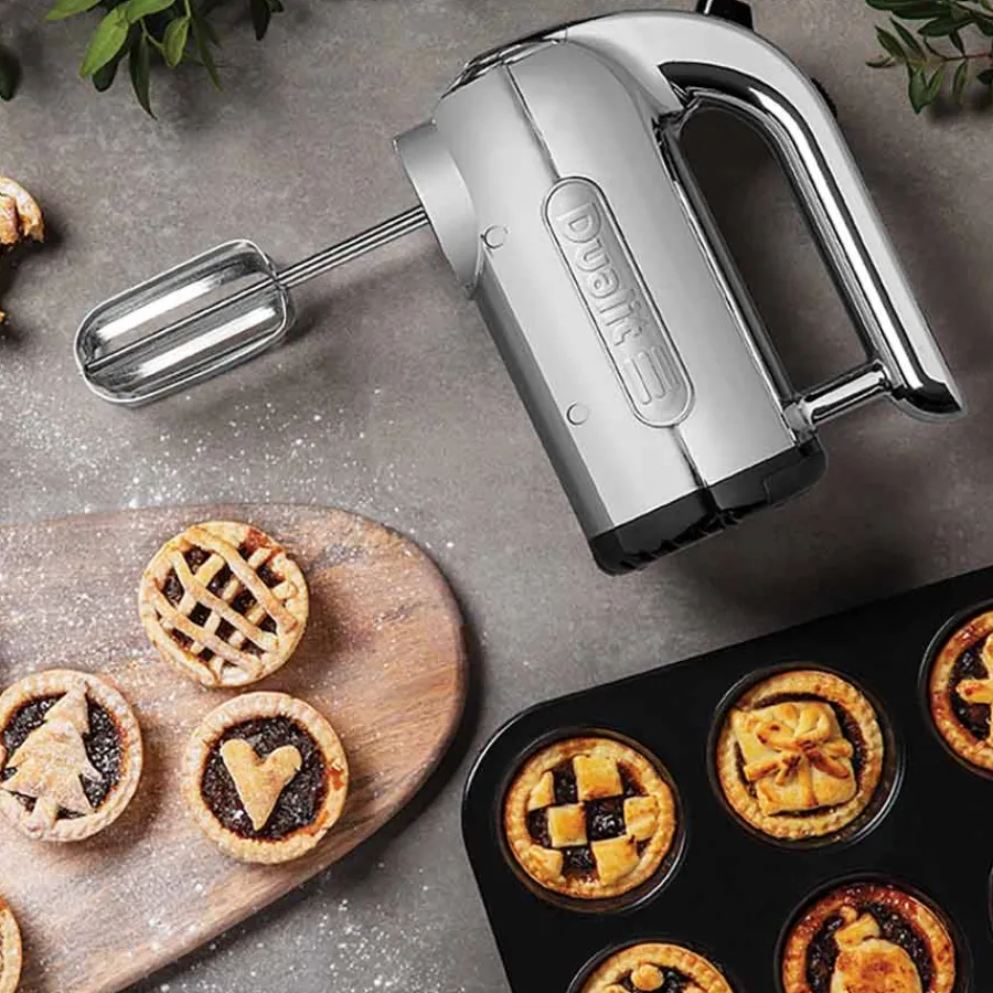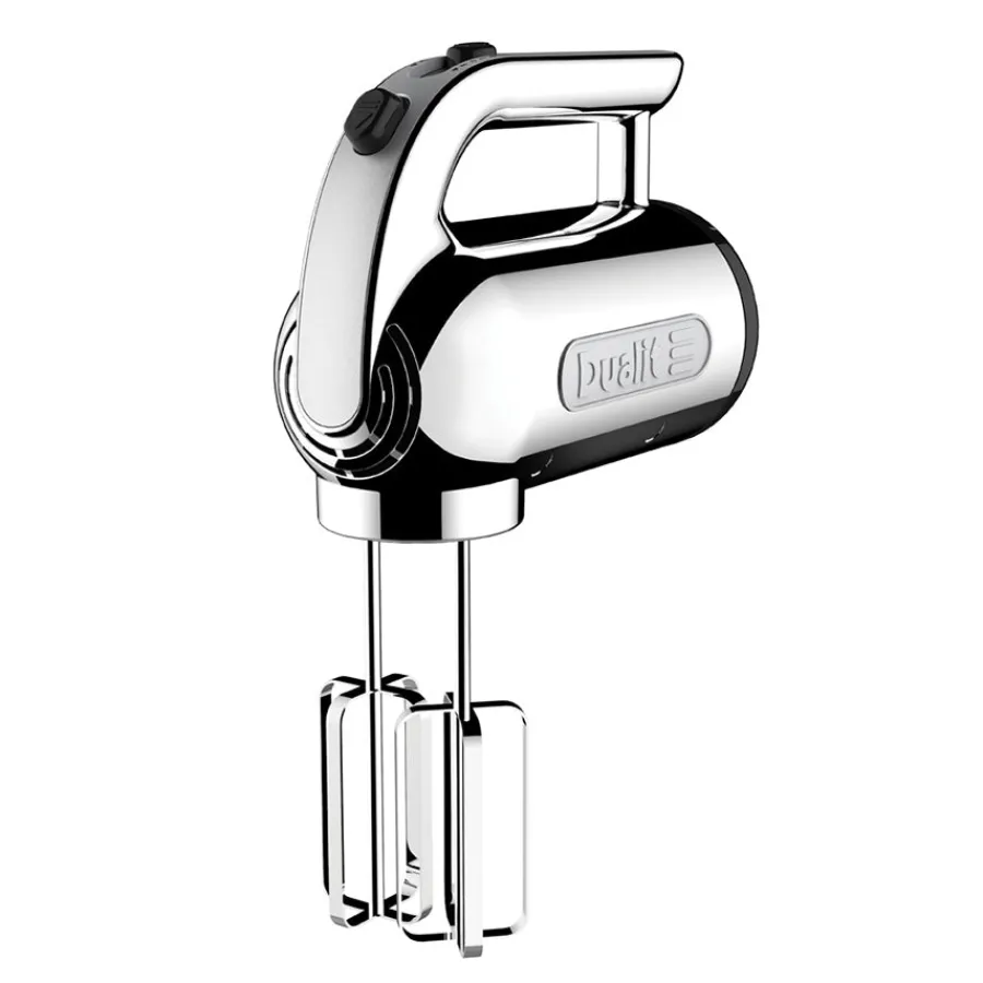 Elektrisk håndmikser i krom fra Dualit. Håndmikseren kommer med en kraftig motor på 400 watt, som i kombinasjon med det stilfulle uttrykket gjør mikseren til en klassiker på kjøkkenet. Med en innstilling på fire ulike hastigheter kan du selv justere etter hvilke typer ingredienser som skal mikses. Følges med både flat visp, ballongvisp og deigkrok. 2 års garanti.