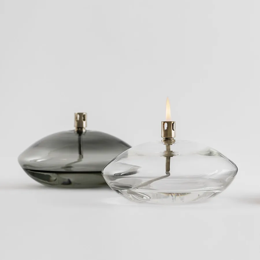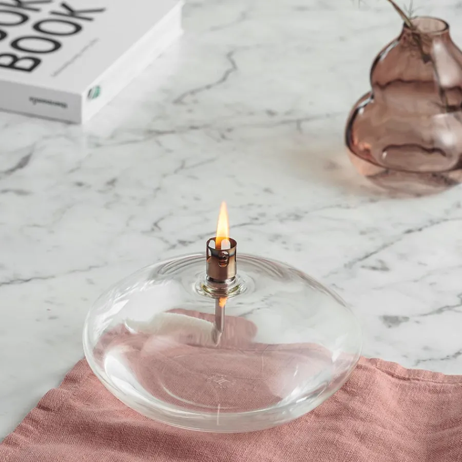 Oljelampe fra Hadeland Glassverk i klart glass. Oljelampen er en perfekt harmoni av tradisjonelt håndverk og moderne design som gir rommet en lun og koselig stemning. Lampen kan plasseres på for eksempel spisebordet, på en skjenk eller en hylle, og blir et visuelt og samtidig praktisk dekorelement. Olje medfølges ikke.
