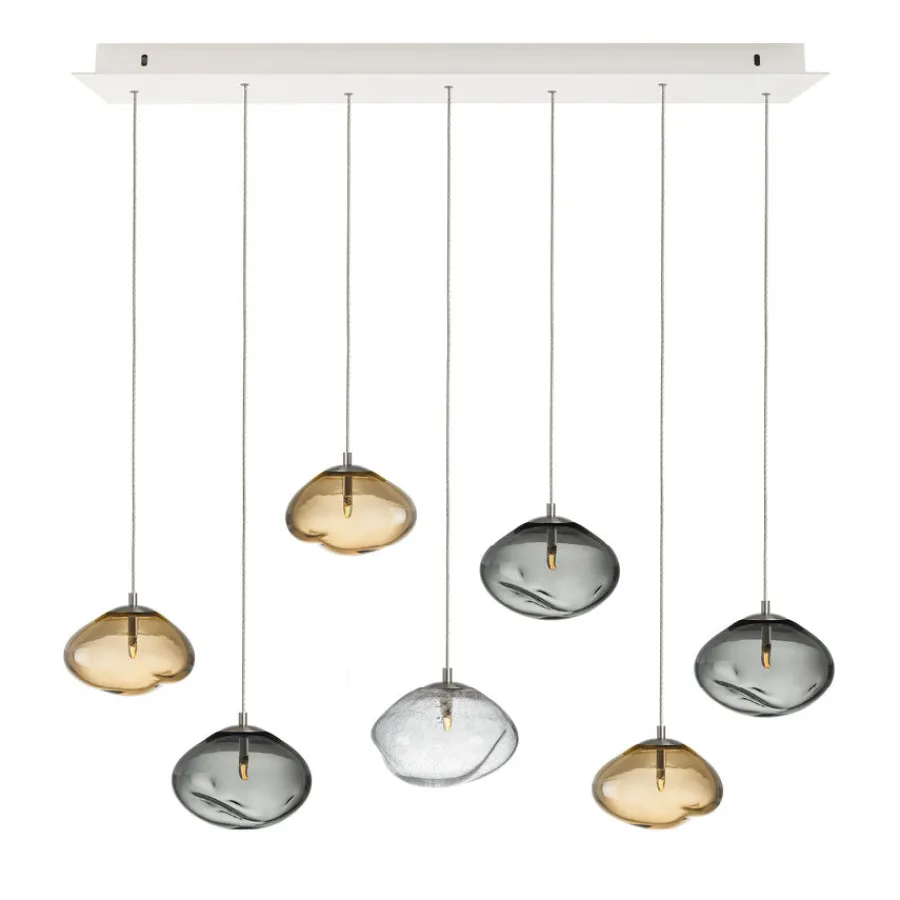 Crystal Stone Terra Mini med 7 pendler fra Hadeland Glassverk er en stilren og naturlig lysinstallasjon inspirert av jordens varme nyanser og teksturer. Komposisjonen kombinerer tre harmoniske farger – klar soda, røkgrå og kakao – og skaper et uttrykk som er både jordnært og eksklusivt. Lampens form og overflate speiler naturens organiske former, og lyset brytes vakkert i det munnblåste glasset.