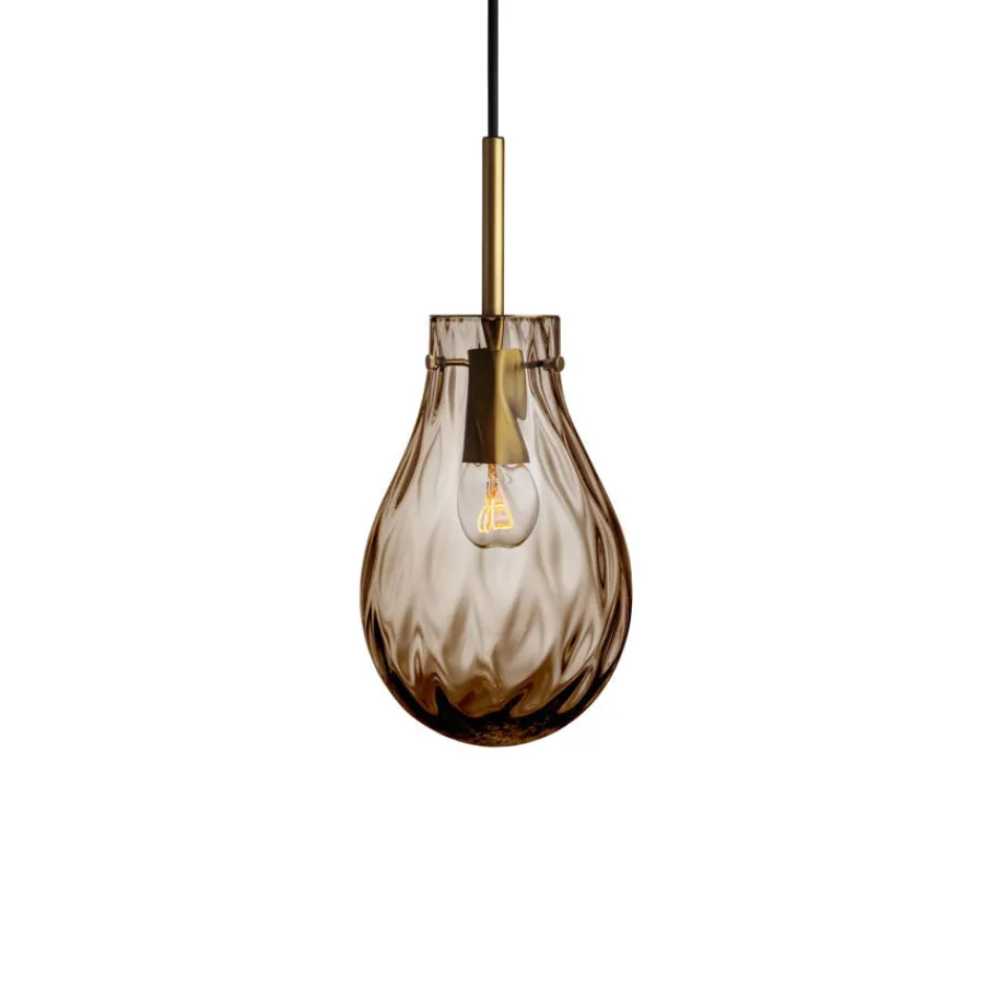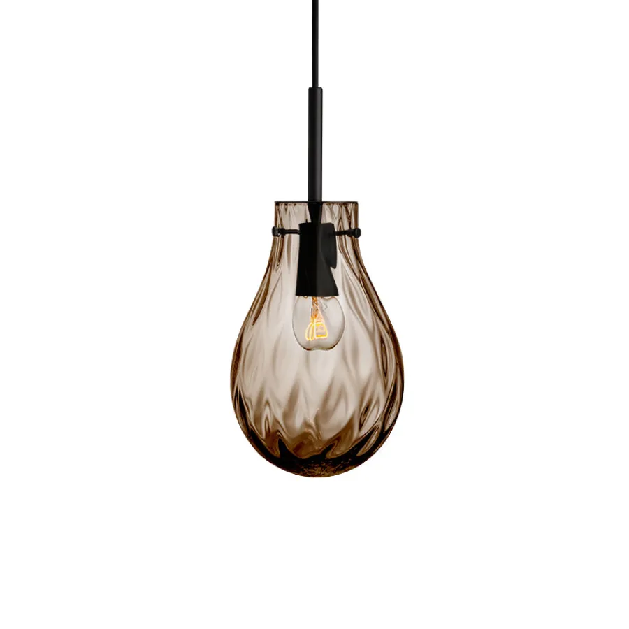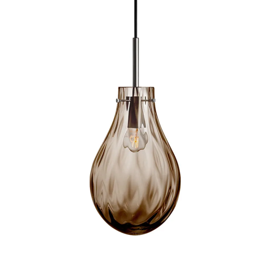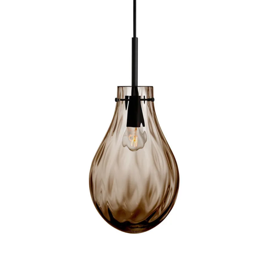 Den nydelige lampen Dråpe Dobbeltoptikk i fargen kakao henter sin inspirasjon fra vannets myke bevegelser og reflekterende overflater. Den munnblåste glasskuppelen har en dyp, varm kakaofarge og kombinerer to ulike mønstre i glasset – en unik dobbeltoptikk som gir et fascinerende spill av lys og skygger på veggen. Effekten er både levende og beroligende, og lampen er like vakker alene som når den henger i en klynge.