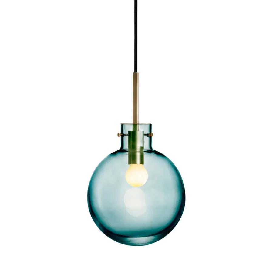 Krystallkule-lampen i blågrønt glatt glass kombinerer friskheten fra havet og dybden fra skogens nyanser. Den munnblåste kulen har en blank, glatt overflate som gir et moderne preg, samtidig som den slipper gjennom et mykt, innbydende lys. Fargen skaper en harmonisk balanse og passer godt både i lyse og mørke interiører.