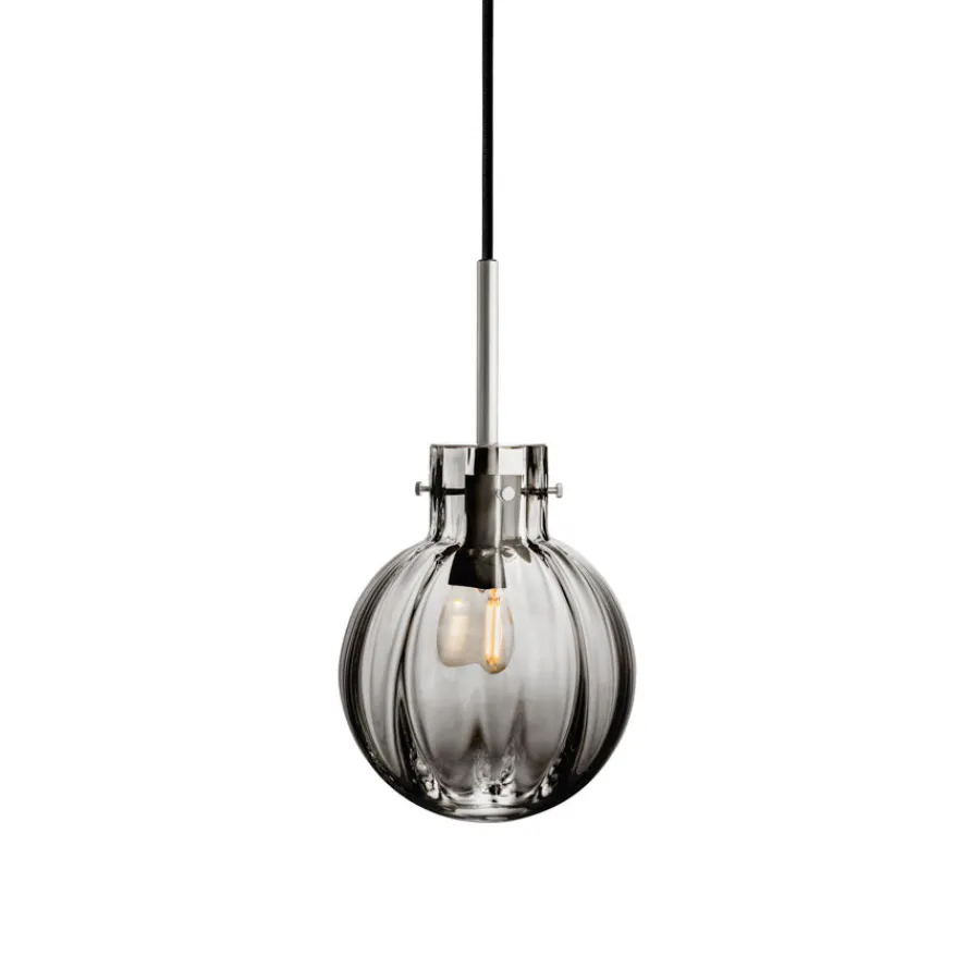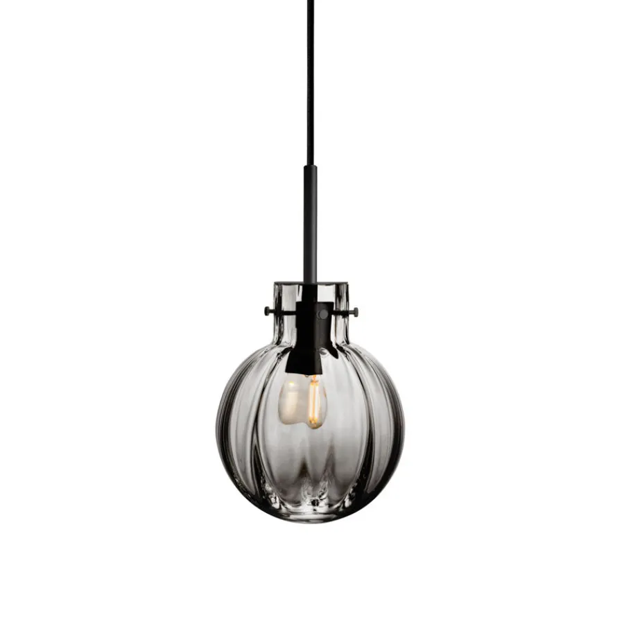 Taklampen med optikk i glasskulen er en stemningsfull lampe som kombinerer håndverkstradisjoner med moderne eleganse. Det karakteristiske optikkmønsteret skapes når den glødende glassmassen presses ned i en ring med stående lameller, som danner dype spor i glasset. Deretter blåses kulen ned i en granittform, noe som gir den en glatt ytterflate og en levende, bølget innerkjerne. Når lampen tennes, skaper dette et unikt spill av lys og skygge som gir rommet en lun og eksklusiv atmosfære.Alle krystallkulene munnblåses og håndslipes på Hadeland Glassverk av våre erfarne glassblåsere og slipere. Mer enn syv ulike håndverkere legger sitt preg på hver lampe, noe som gjør hvert eksemplar unikt. Den røkgrå fargetonen gir en sofistikert og tidløs karakter, som passer like godt alene som i grupper over spisebord, kjøkkenøy eller i stue. Designet er signert Maud Gj. Bugge, og bygger på Hadeland Glassverks stolte håndverkstradisjoner.Lampen leveres med sort tekstiltrukket kabel (3 meter), singel baldakin og er dimbar for fleksibel lyssetting. Montering må utføres av elektriker, og monteringsanvisning følger med.Spesifikasjoner: Sokkel: E14 Pæreanbefaling: Klar, dimbar filamentpære 3–4 W, 220 V Lyskilde medfølger ikke Montering av elektriker påkrevd, monteringsanvisning følger med