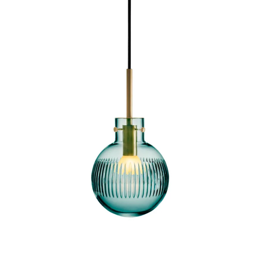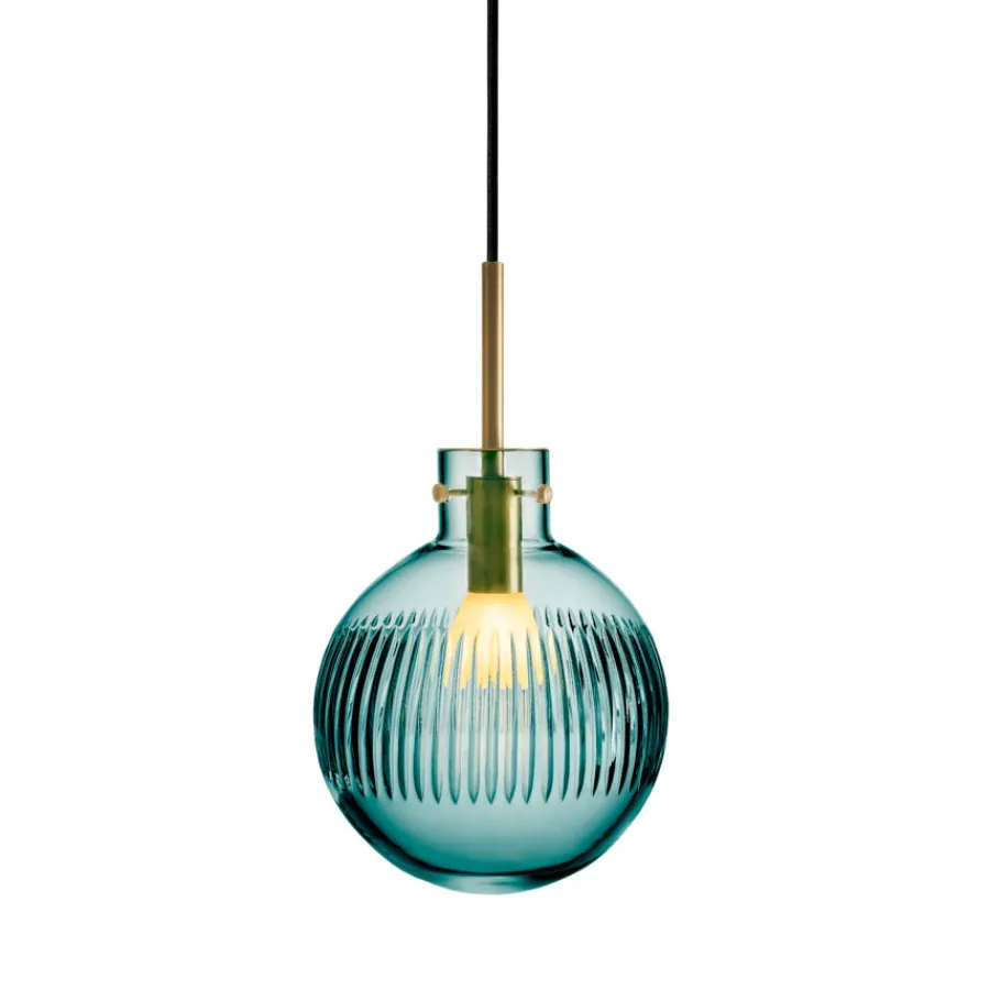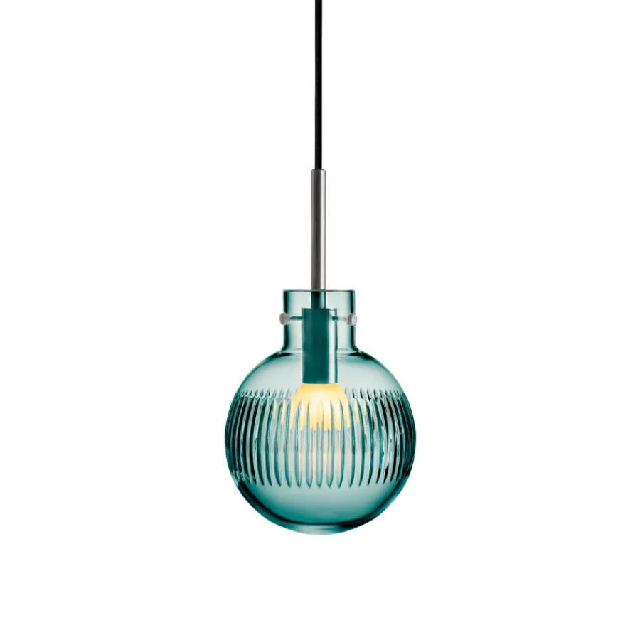 Krystallkule Taklampe Skjær i Blågrønn farge kombinerer friskhet og eleganse med et presist slipemønster. Den glatte krystallkulen håndslipes med vertikale skjær som gir lampen et spennende og levende uttrykk når lyset brytes gjennom glasset.