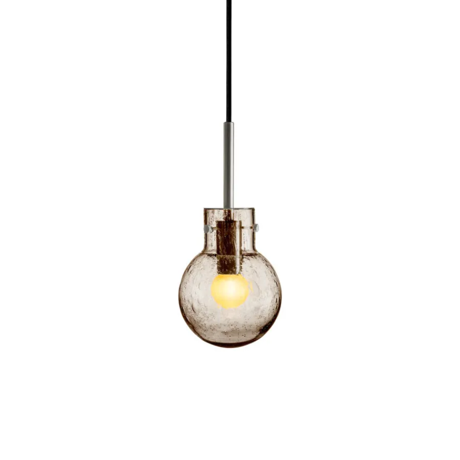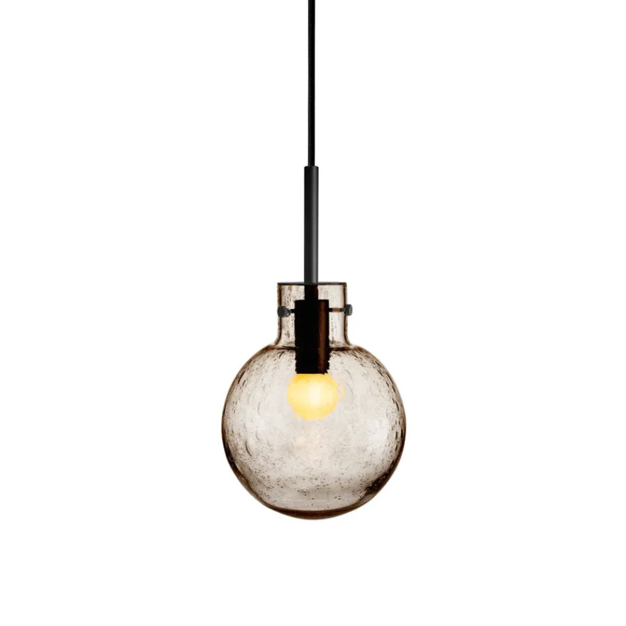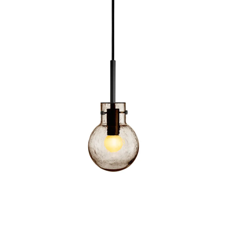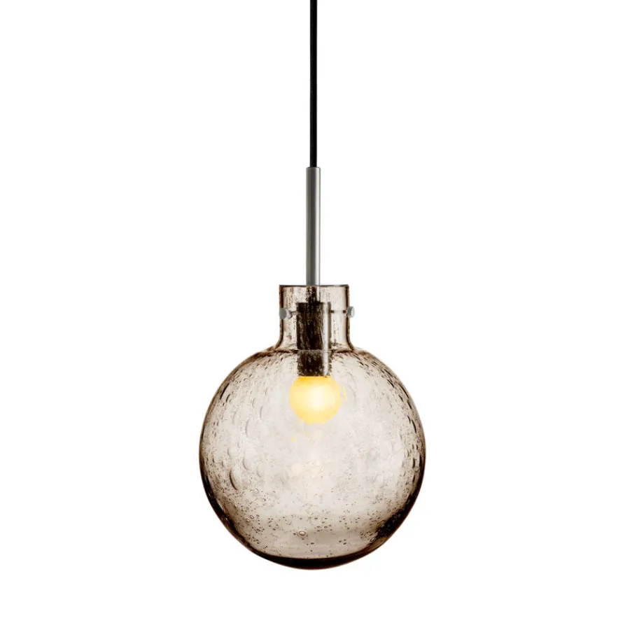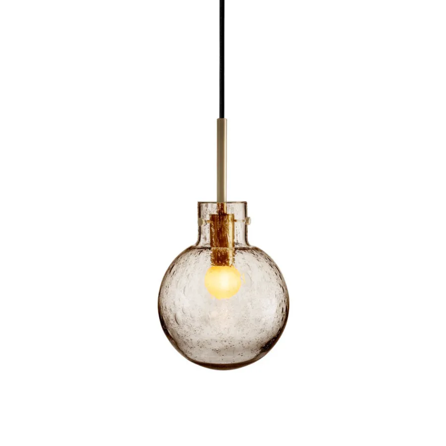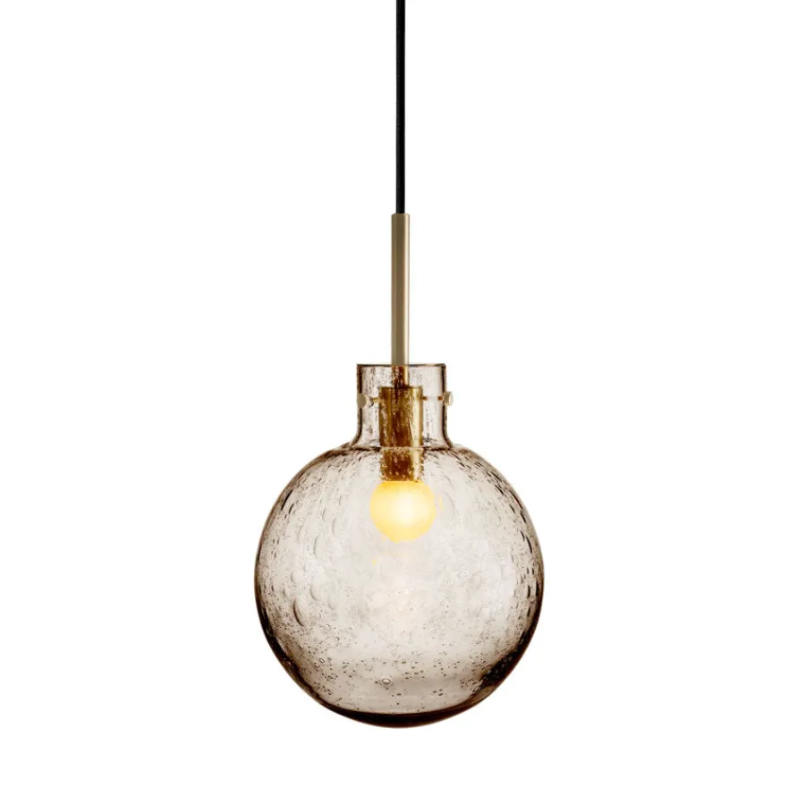 Krystallkule Taklampen i Soda Kakao kombinerer varmt farget glass med det unike boblemønsteret som kjennetegner Soda-teknikken. Teknikken skaper små luftbobler i glassmassen, som gjør hver lampe helt spesiell.