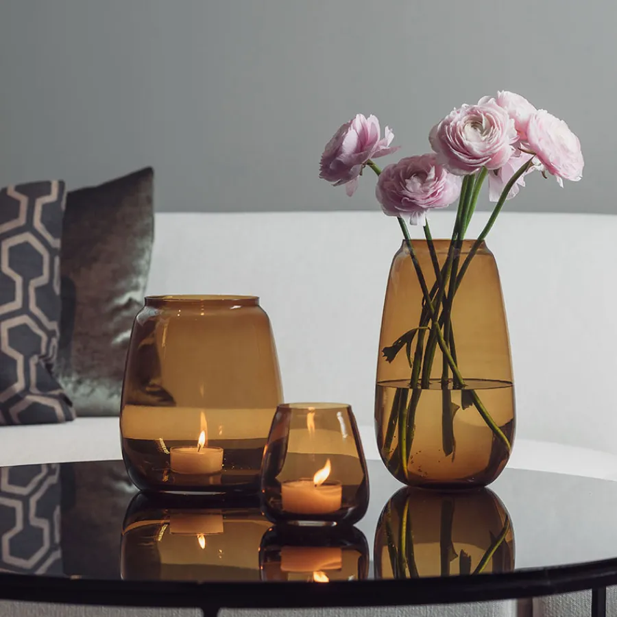 Vase fra Hadeland Glassverk. Serien Siccori består av vaser i flere farger og størrelser som kan kombineres for en helt unikt uttrykk. Vasen er 11 cm høy og kan brukes som lyslykt med levende lys i, eller med små buketter av markblomster. Design: Maud Geruldsen Bugge.