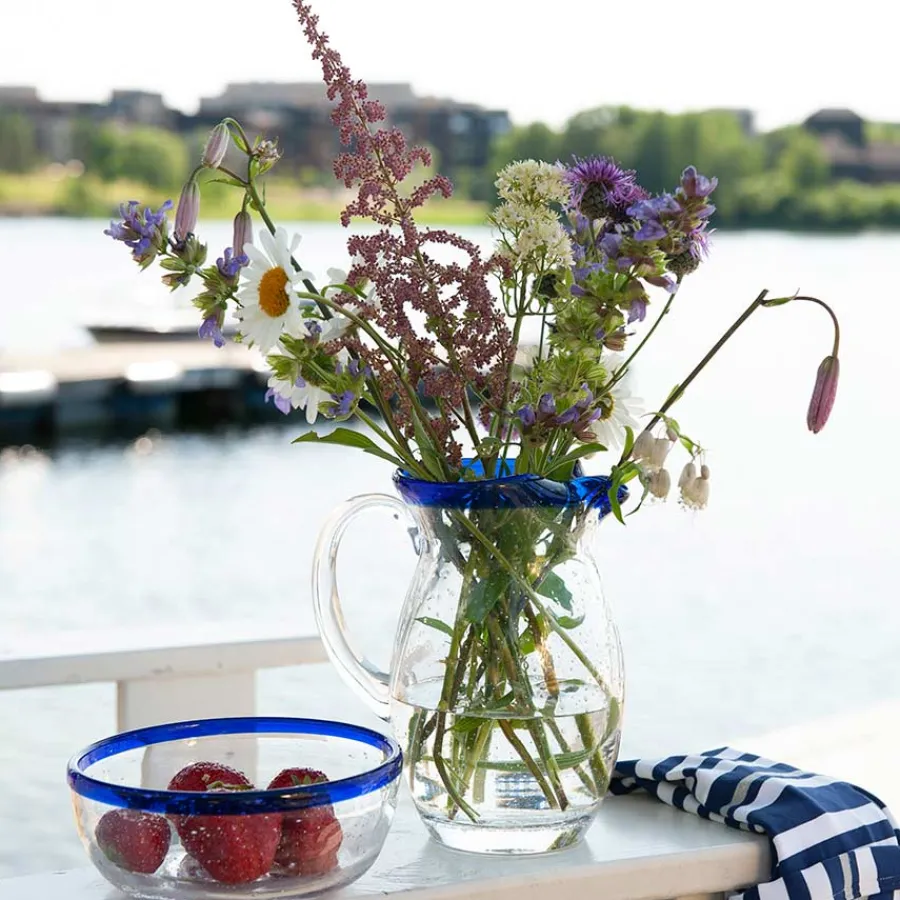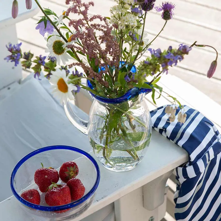 Mugge fra Hadeland Glassverk og serien Skjærgård. Inspirert av den norske skjærgården prydes muggen av en blå rand og bobler i glasset som minnes vannbobler. Designets forfriskende uttrykk gjør muggen perfekt til sommerbordet fylt med en frisk sommerdrikk. Muggen rengjøres for hånd. Serien håndlages som gjør at det kan forekomme variasjoner.
