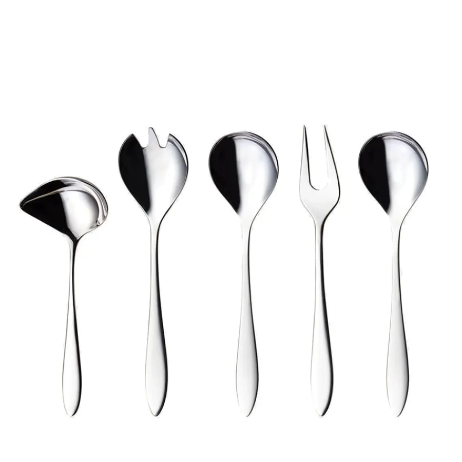 Serveringssett i 5 deler fra Hardanger Bestikk og serien Fjord. Settet kommer i et minimalistisk uttrykk som gjør seg flott til hverdag og fest. Delene er laget i 18/10 rustfritt stål og kan rengjøres i oppvaskmaskin.