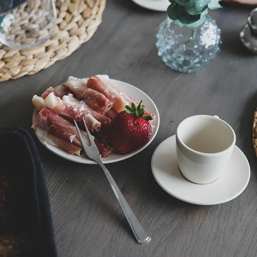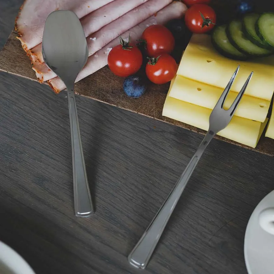 Frokostbestikk i fem deler fra Hardanger Bestikk og serien Ramona. Et sett inneholdende det du trenger av serveringsbestikk til frokost og lunsjbordet. Bestikket er fremstilt i 18/10 stål med en matt finish, flott til ethvert spisebord. Kan rengjøres i oppvaskmaskin.