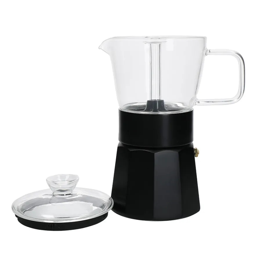 Espressokanne i sort fra La Cafetière. Moderne og spennende utgave av et tradisjonelt italiensk design, her kan du nyte lukten av nylaget kaffe imens du ser den bobler og brygger. Den øverste delen av kannen er laget av varmebestandig borosilikatglass, imens resten er laget av rustfritt stål. Espressokannen er også flott stående på kjøkkenet som et dekorelement.