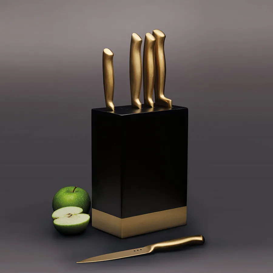 Knivblokk med 5 stilrene kniver fremstilt i fargen gull fra Masterclass. Setter inneholder 5 stk høykvalitetskniver fremstilt i rustfritt stål og en minimalistisk knivblokk i sort tre med en bunn belagt av messing. Knivblokken tar seg godt ut på kjøkkenet, og de flotte knivene er både praktiske og stilfulle.