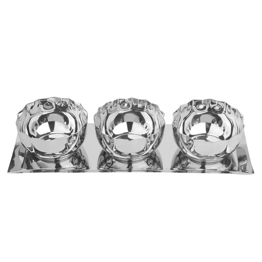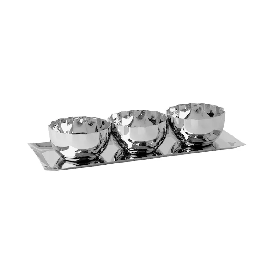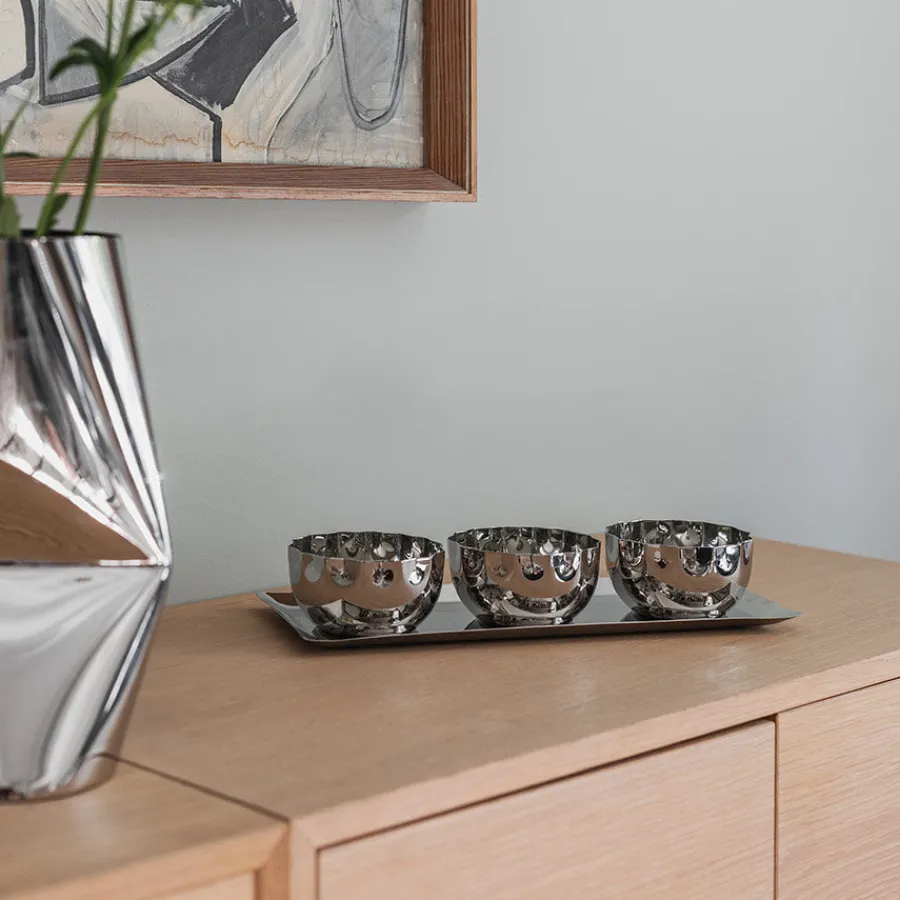 Dette serveringsfatet med tre skåler i rustfritt stål fra Løve Vinje er perfekt for snacks, småretter eller dips. Med en diameter på 30 cm gir det god plass, samtidig som skålene holder innholdet pent adskilt. Den blanke sølvfinishen gir et eksklusivt preg til både hverdags og fest.