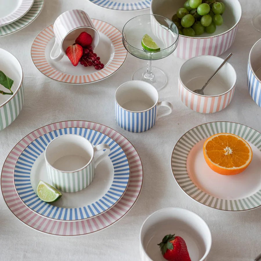 Frisk opp serviset med Abby kaffekopp i blå med elegant gullkant. Det klassiske blå stripemønsteret gir et tidløst og sofistikert uttrykk, mens gullkanten tilfører et hint av luksus. Laget i høykvalitets porselen og rommer 25 cl – perfekt for en kaffe.Kombiner blått med andre farger i Abby-serien for et personlig og lekent uttrykk. Kruset gjør seg like godt alene som i selskap med andre farger på bordet. Den solide utformingen gjør det til et hverdagsfavoritt, samtidig som designet gjør det velegnet til gjestebruk.Ikke egnet for mikrobølgeovn. Håndvask anbefales for å bevare gullkanten.