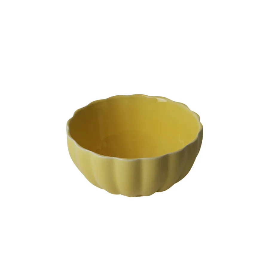 Bolle i en livlig gultone fra Christiania 1739 og serviseserien Lilly. Skålens dekorative bølger som omkranser stykket vil i kombinasjon med den friske fargen dannet et elegant uttrykk til bordet, vakkert til enhver anledning. Et sjarmerende stykke for seg selv, men også stilrik i kombinasjon med flere av servisedelene fra Lilly.