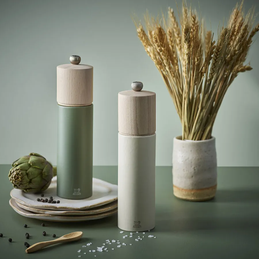 Med sin matte bregnegrønne finish og avrundede design er denne pepperkvernen både dekorativ og behagelig å bruke. Den 21 cm høye formen gir god kapasitet, og det slitesterke kvernverket fra Peugeot sørger for jevn maling hver gang. En stilsikker detalj på kjøkkenet – både i bruk og utseende.